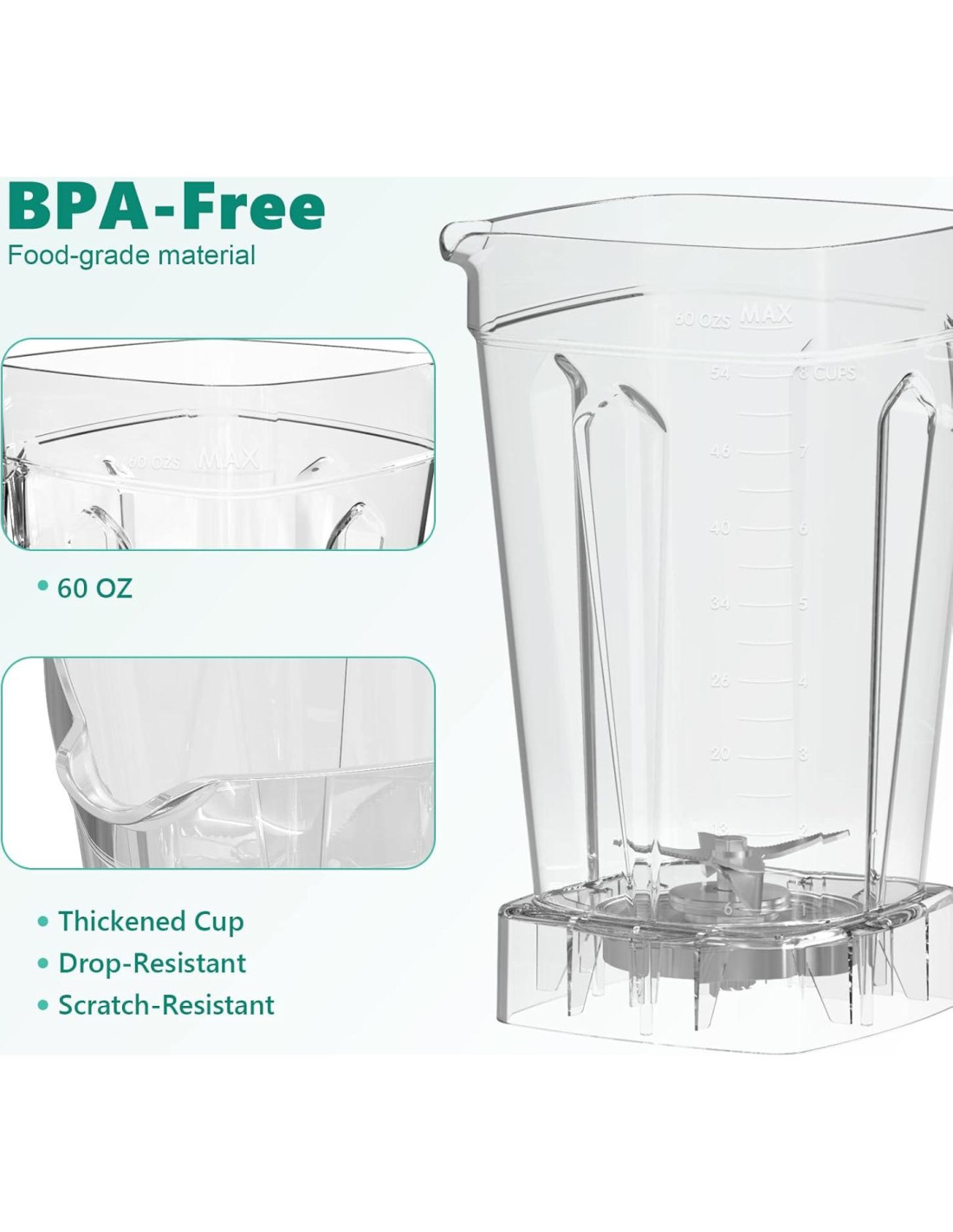 - Jarra de Gran Capacidad: Nuestra jarra de 60oz es de plástico duradero y libre de BPA y puede contener hasta 8 tazas de líquido. Perfecta para hacer grandes cantidades de bebidas para toda la familia, y una licuadora que funciona bien en la cocina