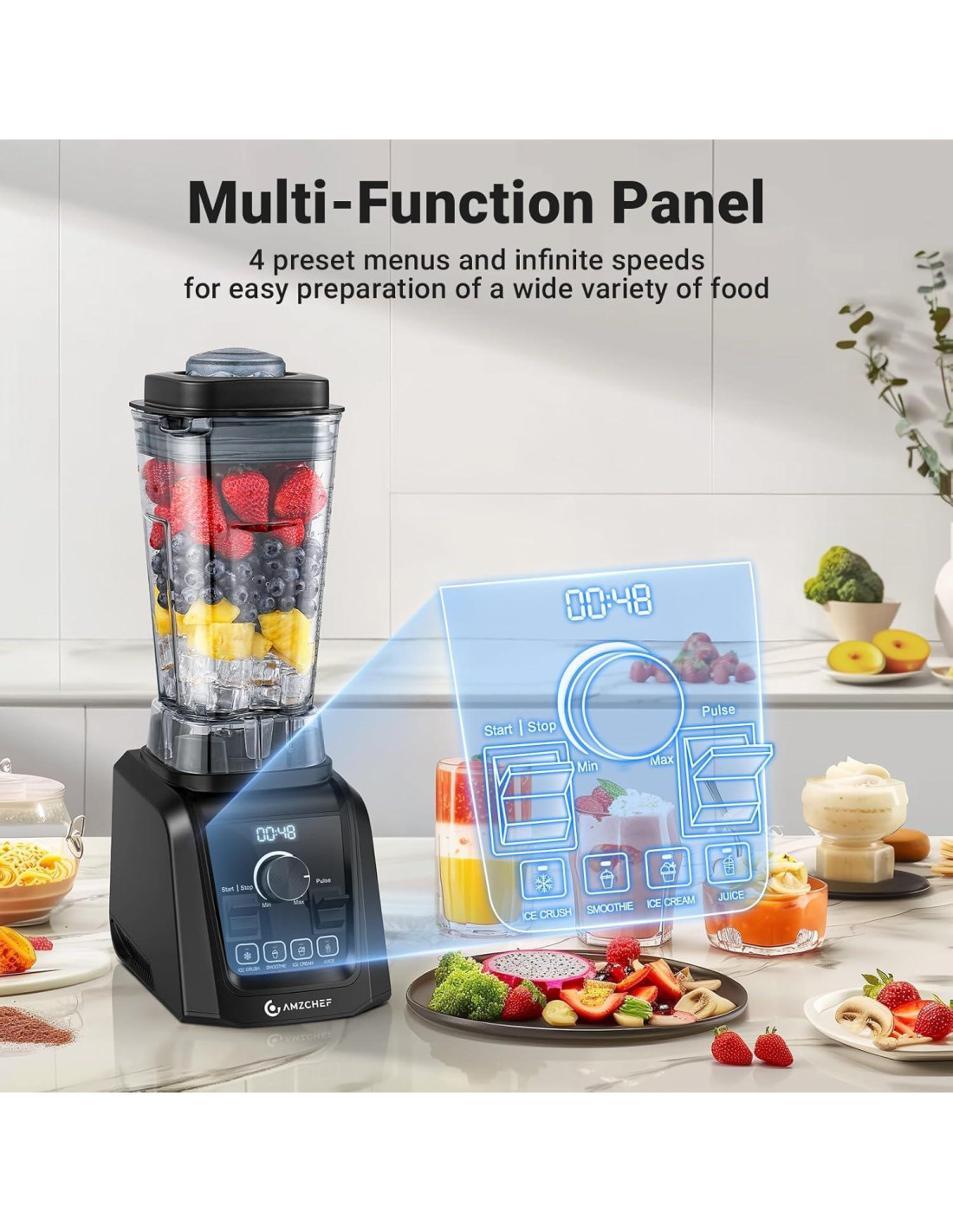 - VELOCIDAD VARIABLE INFINITA: La licuadora AMZCHEF para batidos tiene una marcha de velocidad ILIMITADA. Simplemente gira el botón de la licuadora, puedes ajustar libremente la velocidad hasta alcanzar 32,000 RPM. Te ayuda a triturar fácilmente cubos de hielo, frutas congeladas, nueces, etc. Versatilidad Poderosa en Uno