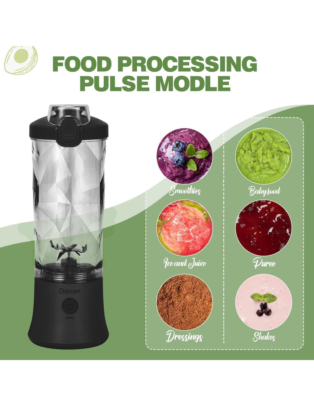 La misión de Devan es empoderar a todos para que puedan hacer fácilmente smoothies perfectos y deliciosos en cualquier momento y lugar, y disfrutar de un estilo de vida saludable y conveniente. Aspiramos a que cada cliente experimente la conveniencia y los beneficios para la salud de nuestra licuadora portátil, comenzando cada día con una nota positiva y refrescante. Hemos superado límites con cuatro generaciones de nuestro producto, cada una revelando actualizaciones innovadoras que redefinen lo que es posible. Aspiramos a que cada cliente experimente la conveniencia y los beneficios para la salud de nuestra licuadora portátil, comenzando cada día con una nota positiva y refrescante. Indicadores LED inteligentes incorporados muestran la energía restante. 1%- 17%: sin luces 18%-33%: 2 luces verdes encendidas 34%-50%: 4 luces verdes encendidas 51%-67%: 6 luces verdes encendidas 68%-83%: 8 luces verdes encendidas 84%-99%: 10 luces verdes encendidas. Totalmente cargada, todas las luces verdes encendidas, luz roja apagada. Motor potente de 270W con tecnología de pulso permite que tu licuadora para batidos y smoothies expanda tu creatividad en cualquier lugar. MODO DE MEZCLA: Perfecto para smoothies, batidos y bebidas mezcladas. MODO DE PULSO: Perfecto para mermeladas, pequeños cubos de hielo, frutas congeladas e ingredientes extra duros. Desde nuestro diseño ergonómico hasta nuestro pico de bebida de flujo rápido y tapa a prueba de fugas, cada parte de nuestra licuadora está diseñada pensando en ti.