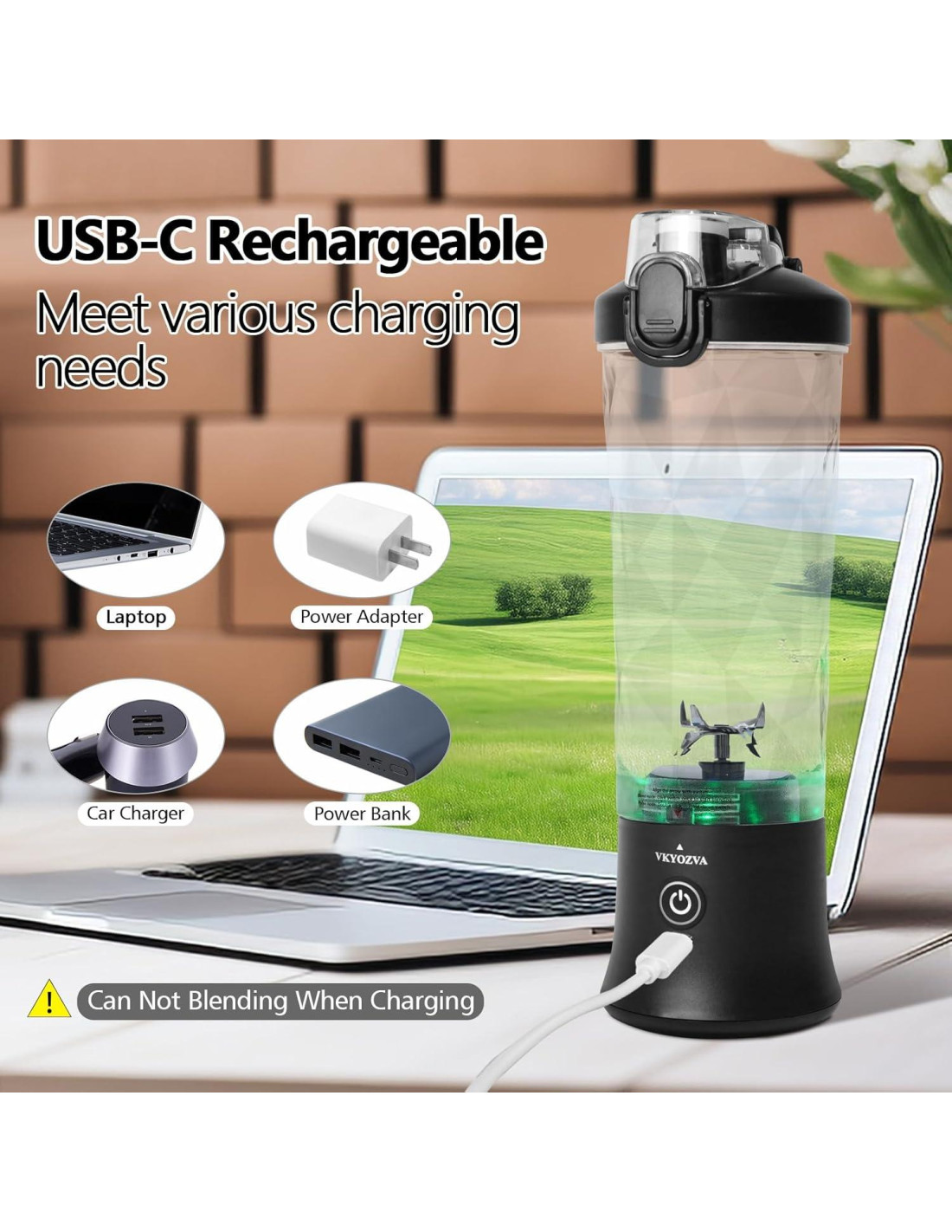 - Comodidad Recargable por USB-C: La batidora mini VKYOZVA cuenta con un puerto de carga a prueba de agua USB-C, alimentado por una batería interna de 4000mAh. Una carga completa toma de 3 a 5 horas y proporciona suficiente energía para 25 tazas de jugo. Di hola a la libertad de mezclar con compatibilidad en dispositivos, desde tu laptop hasta tu auto. Carga en Cualquier Lugar, Mezcla en Todas Partes.