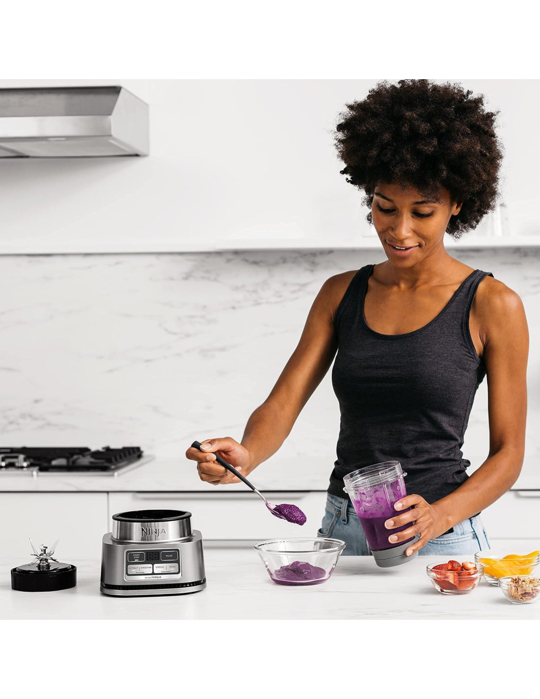 - Incluye motor denso de potencia de 1200 vatios de pico, cuchillas Hybrid Edge, (2) Tazas de Extracción de Nutrientes Ninja de 24 onzas líquidas (710 ml) y tapas de pico, Hacedor de Tazones de Batido Ninja de 14 onzas líquidas (414 ml) y tapa de almacenamiento, y Guía de Inspiración de Recetas.