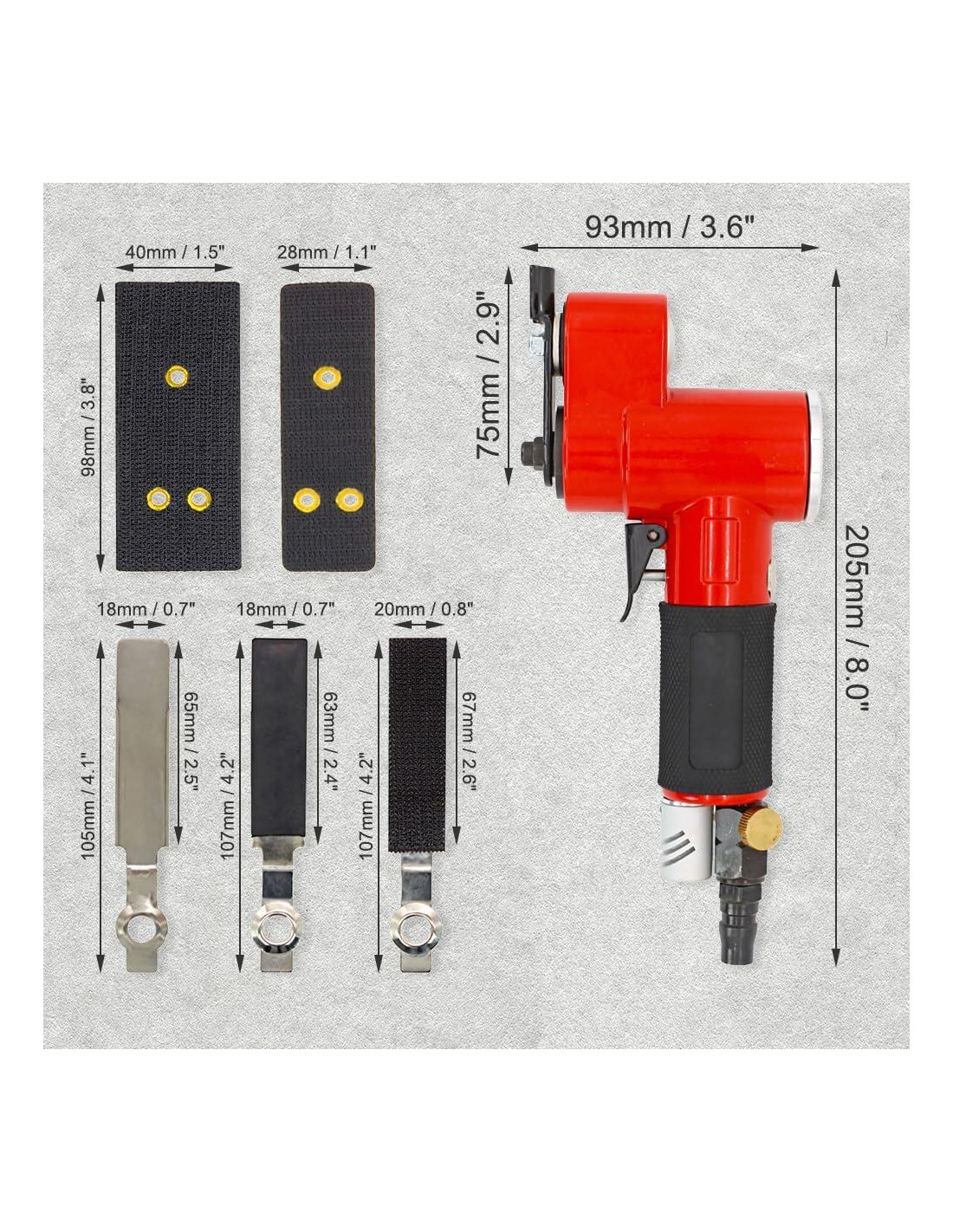 - Productos Incluidos: 1*lijadora de aire, 2*chasis de pila cuadrada, 1*peli de pila, 1*hoja de acero blanca, 1*hoja de acero blanca con adhesivo, 2*papel de lija de 20 pulgadas (50,8 cm)