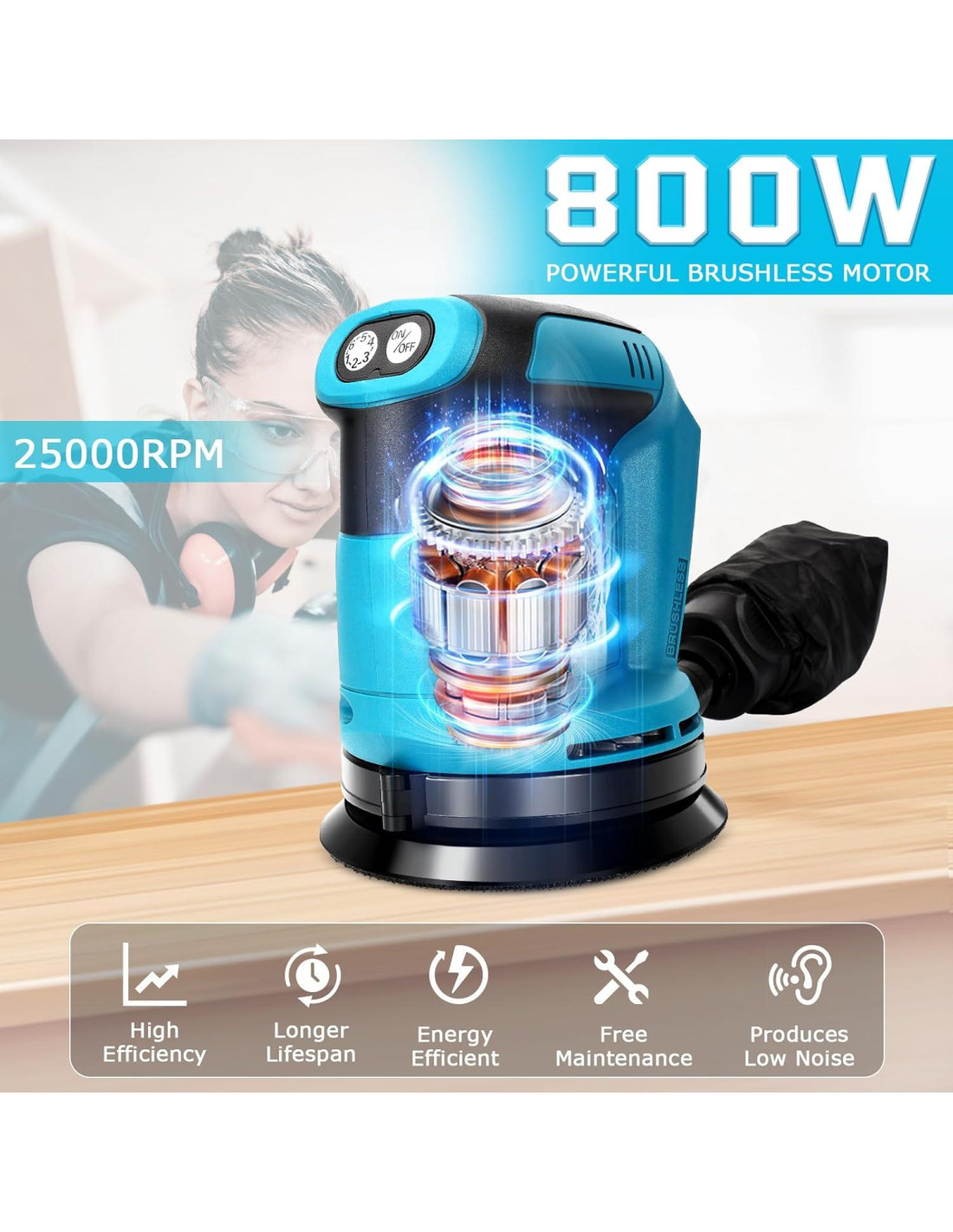 - Motor Sin Escobillas: Los motores sin escobillas no solo reducen el desgaste mecánico y la pérdida de energía, sino que también mejoran significativamente la velocidad y el par de salida. Después de estar equipado con un motor sin escobillas, esta lijadora orbital aleatoria puede satisfacer fácilmente las necesidades de molienda de materiales con diversas durezas. Mientras tanto, la larga vida útil y las características de bajo ruido de los motores sin escobillas mejoran aún más el rendimiento general y la experiencia del usuario de la herramienta.