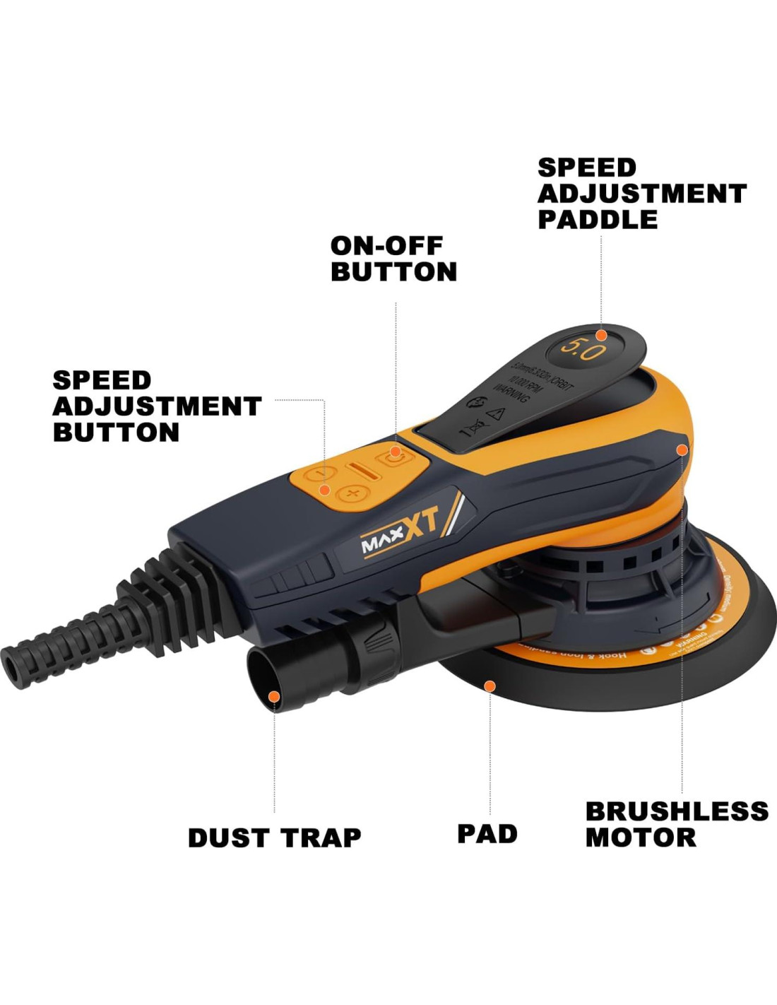 - Rendimiento Mejorado con Motor EC. Nuestra lijadora orbital aleatoria está equipada con un motor sin escobillas EC, asegurando una mayor vida útil y ofreciendo un rendimiento constante y potente. Este diseño de motor mejora la estabilidad durante el uso y reduce efectivamente la vibración transmitida a tu mano, minimizando la fatiga y mejorando la comodidad general durante tus tareas de lijado.