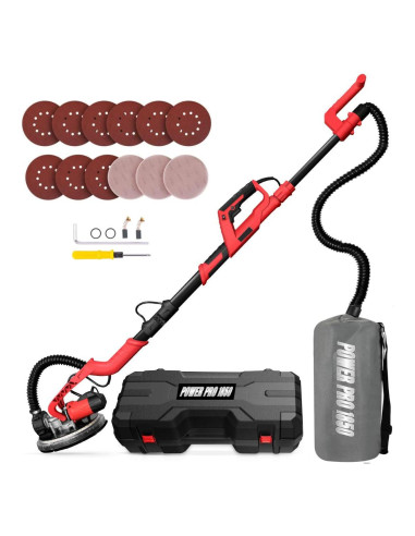 Vacío automático / Motor potente / LED 360 / Velocidad variable / Cabezal pivotante / Mango extensible / 12 discos de lijado / Estuche duradero / Plegable