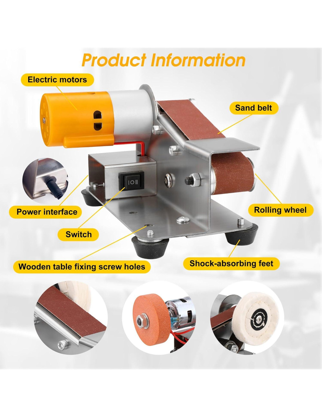 Material: Acero Inoxidable Tamaño de la Lijadora de Banda de Banco: (170mm x 100mm x 50mm / 6.7 x 4 x 2 pulgadas) Voltaje de Entrada: 110V ~ 120V Potencia de Salida: 12V~24V Modo de Regulación de Velocidad: 7 Velocidades Ajustables Velocidad Máxima: 4000-9000 PRM Peso del Producto: 1.4KG Modo de Interruptor: Interruptor de Dos Vías Modelo de Motor: Eje de Salida Doble 775 Tamaño de la Banda de Lijado: (330mm x 30mm / 13 x 1.2 pulgadas) Este kit de lijadora de banda de banco incluye 9 tipos de accesorios: