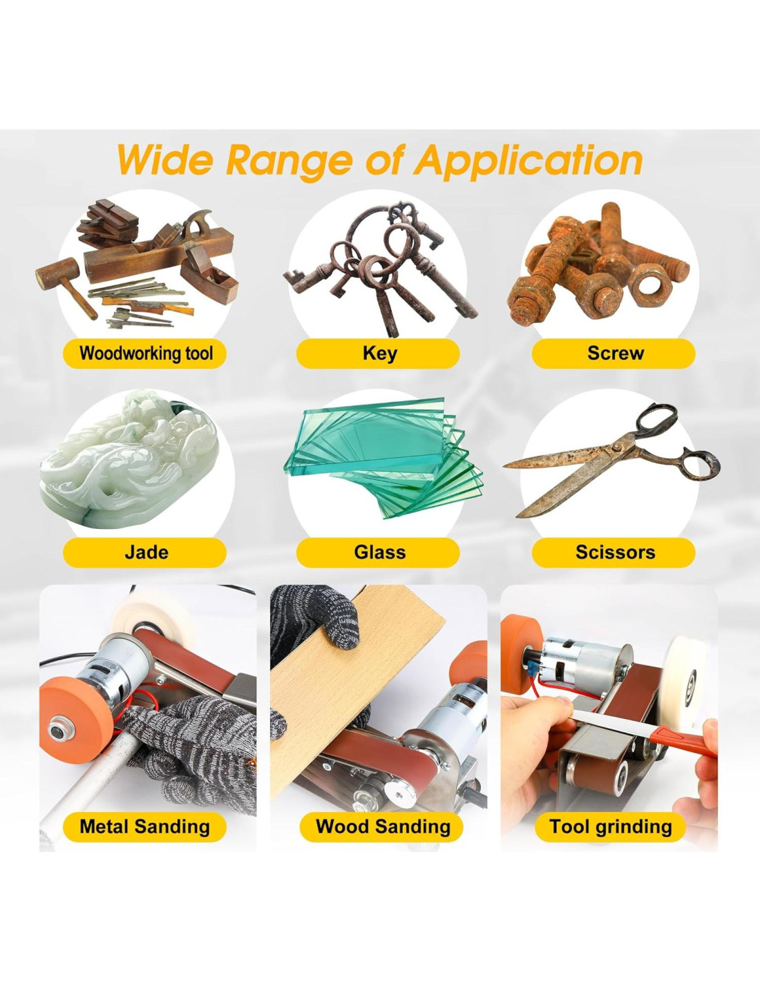 - [Multifuncional] : Este mini afilador de cuchillos tiene un ángulo de banda de lijado fijo de 15 grados y está equipado con 5 bandas abrasivas de diferentes granos, a saber, 120#, 320#, 600#, 800#, 1000# cada una de 6 piezas. Facilita el afilado del cuchillo. Por lo tanto, esta lijadora de banda de banco es perfecta para afilar bordes de herramientas, fabricación de cuchillos, trabajo en madera, trabajo en metal, bricolaje de joyería, molienda fina y pulido. Y si se utiliza con otros accesorios, esta Mini Lijadora de Banda también se puede usar para perforar, ruedas de molienda, pulido de ruedas de tela, pulido de discos, etc.