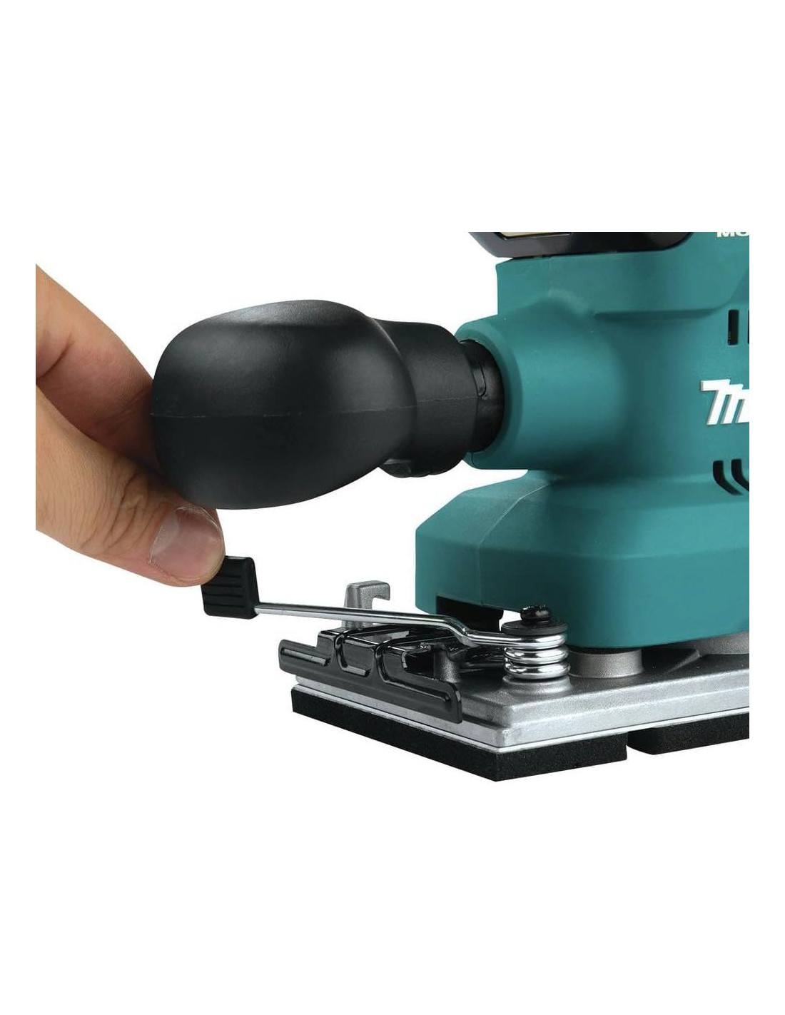 La lijadora de acabado de 1/3 de hoja sin cable Makita 18V LXT ofrece toda la potencia y control de una versión con cable pero sin el cable. Ofrece una acción de oscilación de 1/16" (1.59 mm) con un lijado más rápido que está diseñado para un acabado sin remolinos. Hay tres configuraciones de velocidad a 4,000, 8,000 y 12,000 Órbitas Por Minuto (OPM) que se pueden seleccionar a través de un conveniente control de velocidad de un toque, mientras que las ubicaciones de la batería y el motor están diseñadas para reducir el aleteo para una superficie más uniformemente acabada. Se puede conectar al Sistema Inalámbrico de Inicio Automático de Makita (AWS) utilizando Bluetooth para la comunicación inalámbrica de inicio/parada entre la lijadora y un extractor de polvo opcional (se vende por separado). Es parte del sistema 18V LXT en expansión de Makita, el sistema de herramientas inalámbricas más grande del mundo alimentado por baterías de iones de litio de estilo deslizante de 18V. Las baterías de iones de litio Makita 18V LXT tienen los tiempos de carga más rápidos en sus categorías, por lo que pasan más tiempo trabajando y menos tiempo sentadas en el cargador.