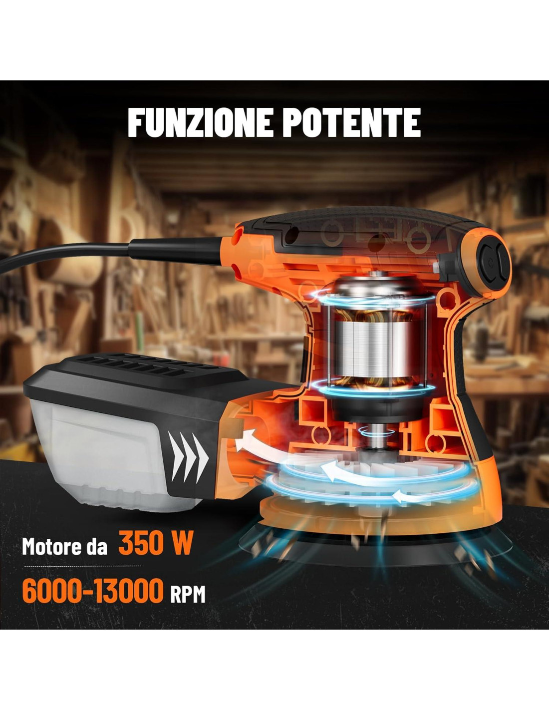 - RENDIMIENTO PODEROSO: Equipado con un motor de cobre puro de 3 Amperios, esta lijadora orbital ofrece hasta 13000 rpm para una variedad de tareas de lijado y pulido en madera, metal y PVC, así como para la eliminación de pintura y barniz de superficies planas o curvas