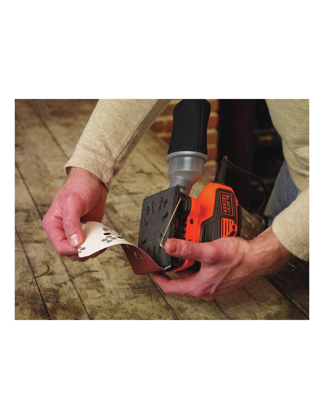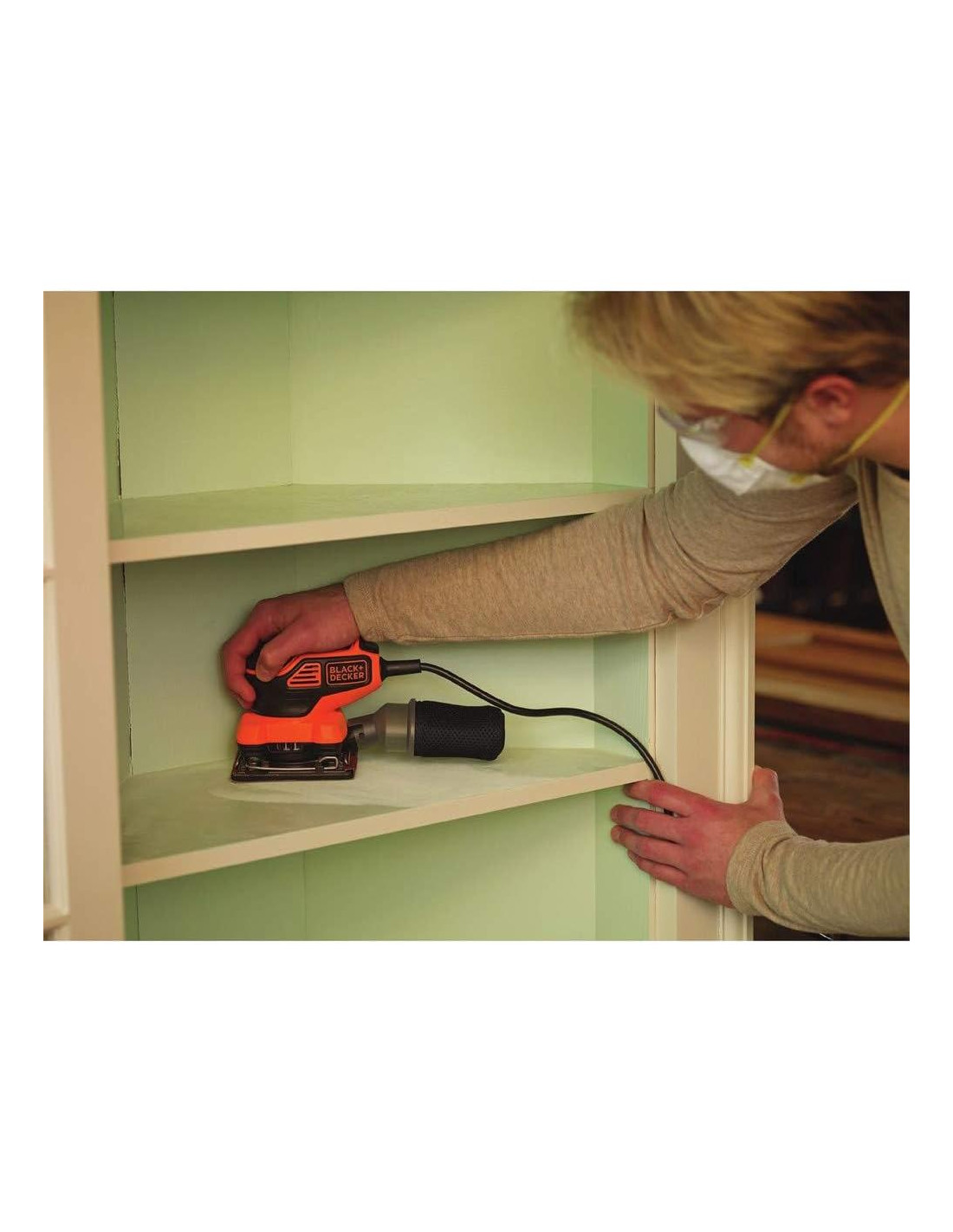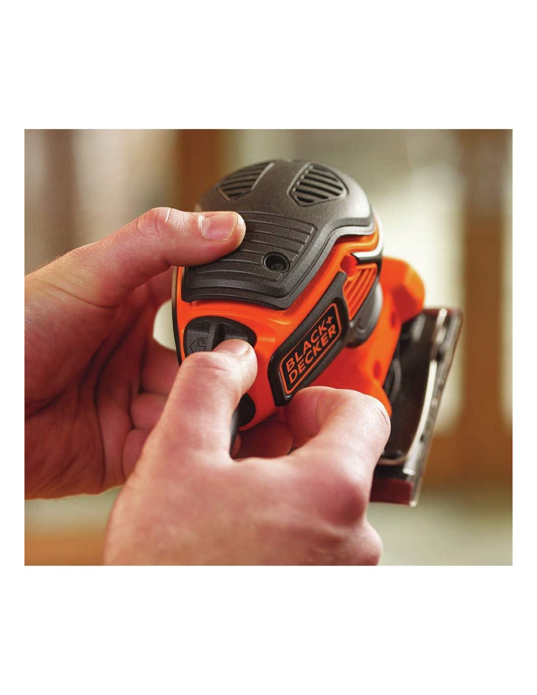La lijadora orbital eléctrica de 1/4 de hoja BLACK+DECKER ofrece mucha potencia para un diseño tan compacto. Perfecta para preparación de superficies, lijado de acabado y trabajo de detalle en madera, metal y plástico, esta lijadora orbital está diseñada pensando en tu comodidad. El interruptor de paleta con agarre suave está ubicado en la parte superior de la lijadora para un encendido y apagado natural y conveniente. Bloquear la lijadora en la posición de encendido o apagado permite un uso fácil con una sola mano. Esta lijadora orbital también proporciona acceso a espacios reducidos y lija al ras en 3 lados. El motor de 2.0 Amperios proporciona 16,000 oscilaciones por minuto, mientras que la bolsa de recolección de polvo de alto rendimiento ayuda a mantener la superficie de trabajo más limpia. Además, los sujetadores de papel hacen que cambiar la lija sea realmente fácil. Y gracias a su diseño con cable, nunca te quedarás sin energía.