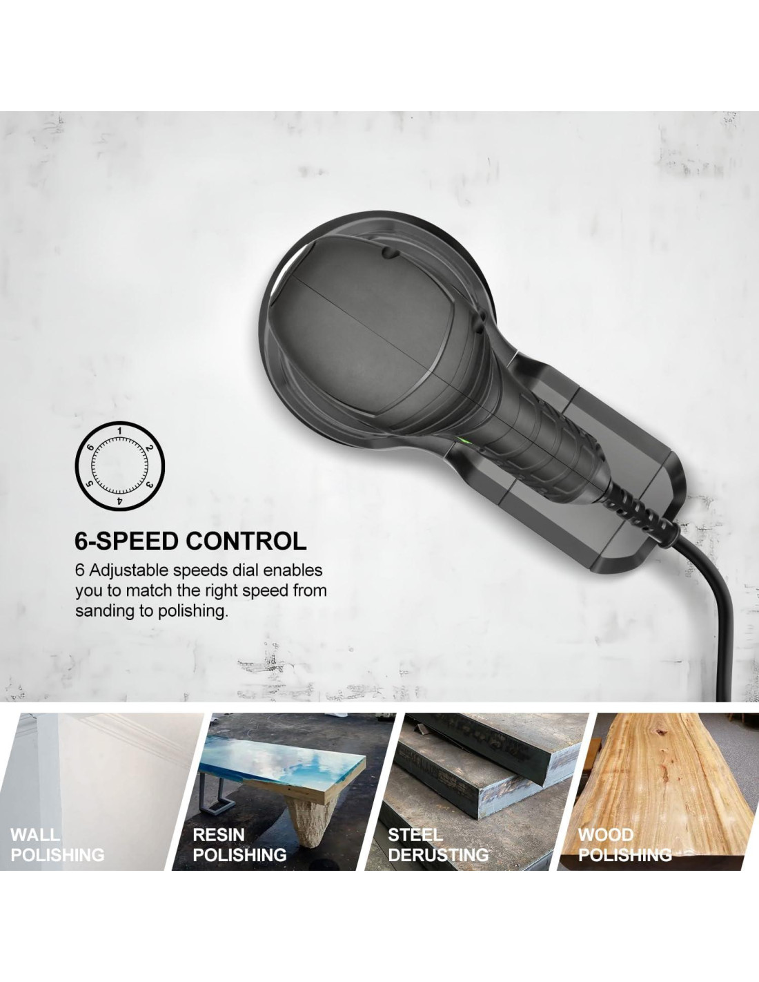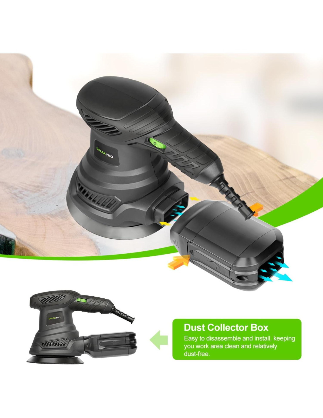- Componentes incluidos: Lijadora orbital aleatoria, 20 Piezas de Papeles de Lija (P60x5, P80x5, P100x5, P120x5), recipiente de polvo