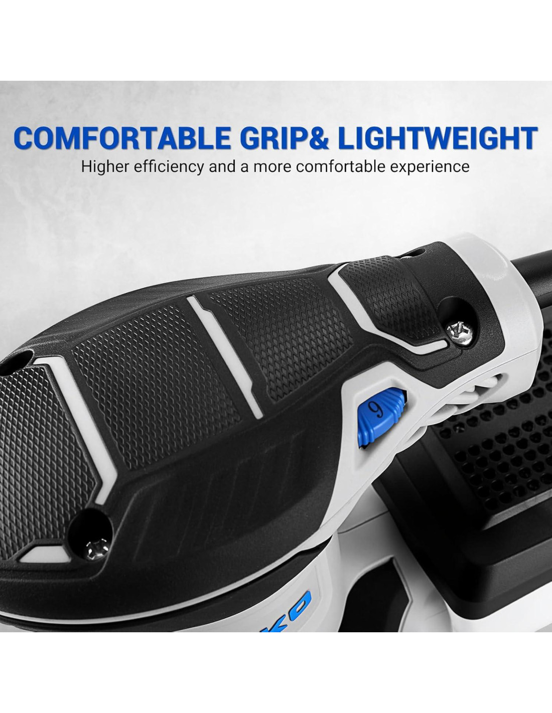 - FÁCIL CONTROL Y BAJA VIBRACIÓN La lijadora orbital cuenta con un agarre de goma ergonómico para máxima comodidad y control. Mientras tanto, el diseño de contrapeso equilibrado reduce la fatiga causada por la vibración en las manos, prolongando así el tiempo de trabajo.