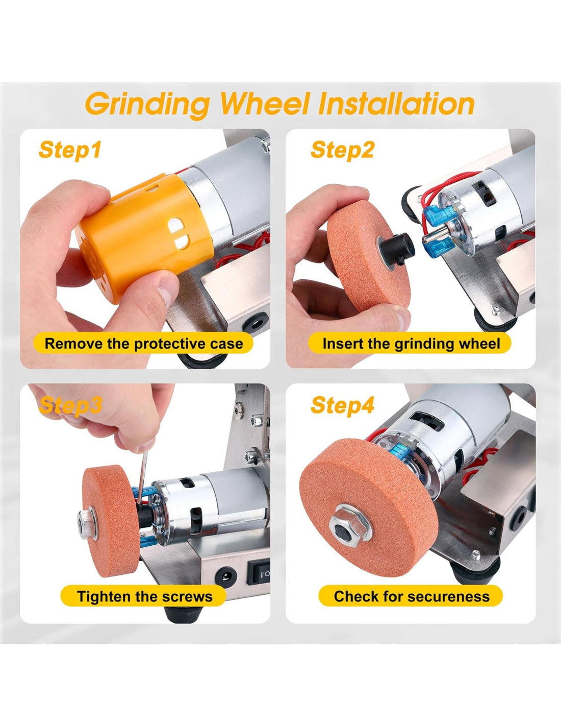 - [Kit de Afilador de Cuchillos de 7 Velocidades Ajustables] : La Rueda de Afilar y las Ruedas de Pulido se pueden instalar en ambos lados del motor de la lijadora de banda, transformándola en una lijadora de banco pequeña versátil. La rueda de afilar se utiliza para la superficie de hueco, y la banda de lijado se utiliza para la superficie sin hueco. Se utiliza una banda de lijado de grano grueso para superficies rugosas, mientras que una banda de lijado de grano fino se utiliza para superficies suaves. Configuraciones ajustables de 7 velocidades y puede girar en ambas direcciones, variando desde baja velocidad para pulido fino hasta alta velocidad para lijado rápido.