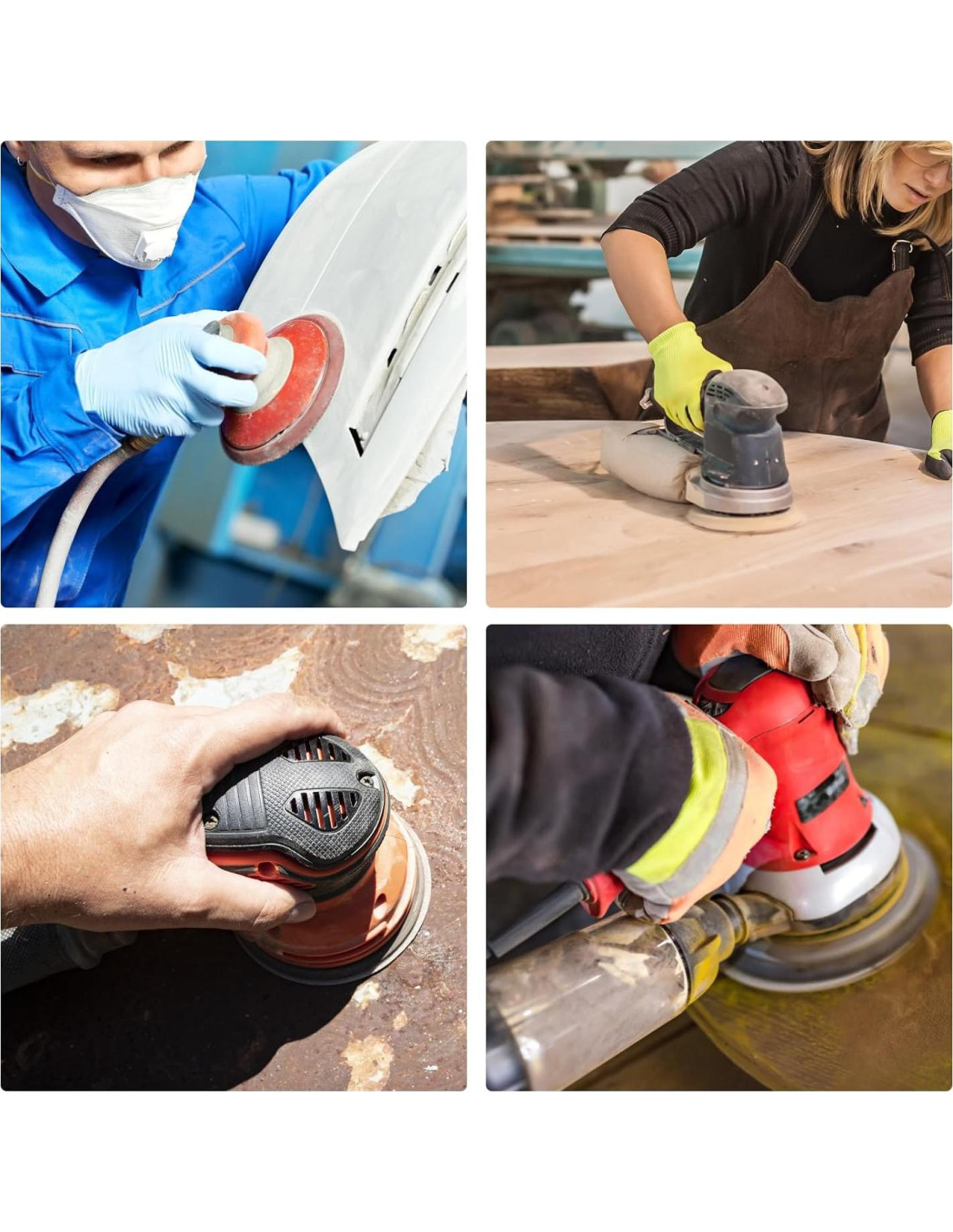 - El respaldo del disco de lijado de 5 pulgadas está hecho de respaldo de felpa de alta densidad de 110g/m, que no se quita fácilmente de la lijadora orbital aleatoria.