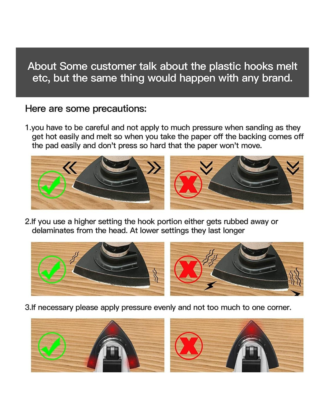 - [5 Almohadillas de lijado en forma de triángulo] Discos de lijado para herramientas multifuncionales de una amplia gama de herramientas oscilantes están hechos de plástico de alta calidad con gancho y lazo y espuma de amortiguación para una velocidad de trabajo rápida y larga vida útil. El conjunto contiene 5 discos de lijado triangulares de 80 mm x 80 mm. La combinación ergonómica de almohadillas de lijado y papel de lija satisface sus necesidades diarias.