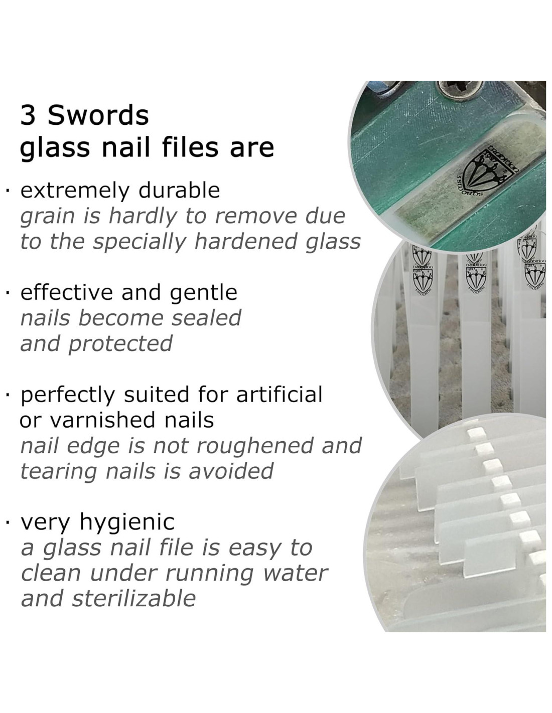 - CONTENIDO: Lima de uñas de vidrio, pulidor de uñas de 3 vías, estuche de plástico negro para un transporte seguro y limpio, longitud 4.5 pulgadas (11.5 cm).