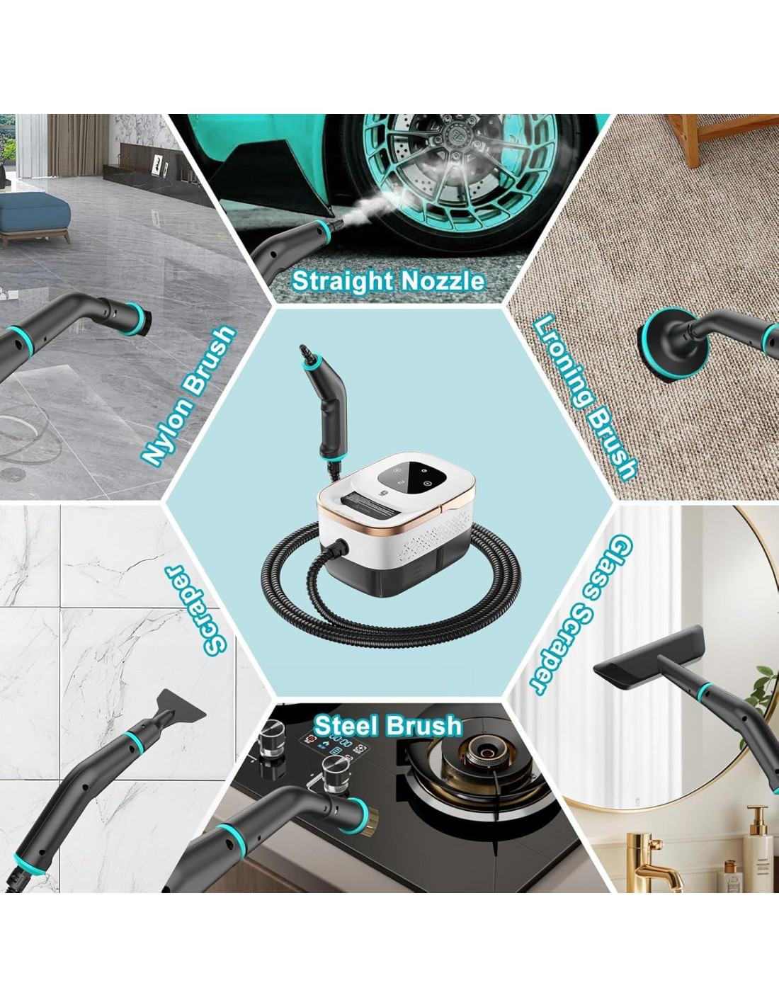 - Limpiador de Vapor Potente - El Limpiador de Vapor opera con una potencia de 2500W, esta máquina de vapor para limpieza se calienta en solo 15 segundos, generando 4BAR de presión y vapor a 221F (105C), entregando vapor a alta temperatura para eliminar la suciedad de manera efectiva. El limpiador de vapor de mano es ideal para azulejos y lechada, convirtiéndolo en un limpiador de vapor confiable para el baño. Compacto pero eficiente, este limpiador de vapor presurizado para el hogar asegura una limpieza potente y sin humo o residuos dañinos, especialmente amigable para mascotas y niños.