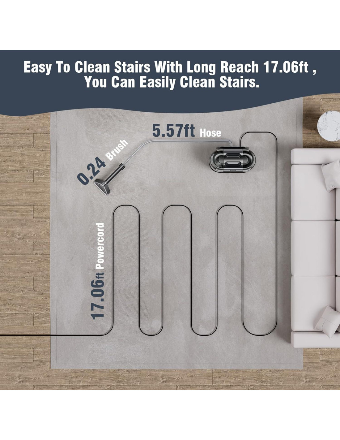 - LIMPIEZA PORTÁTIL. La máquina limpiadora de tapicería viene con una manguera ultra larga (1.70m) y un cable de alimentación (5.20m), y la pequeña máquina limpiadora de alfombras es ligera y fácil de mover de un trabajo de limpieza a otro. El cepillo y el cable de alimentación se pueden almacenar en el gancho de la máquina para ahorrar espacio.