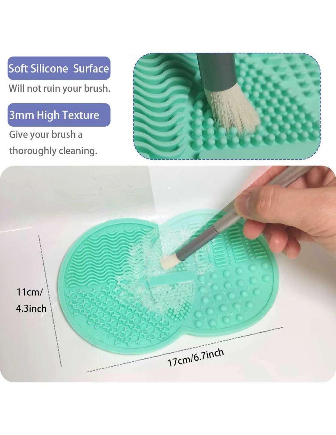 - Material de Silicona Suave: La alfombrilla de limpieza de brochas de maquillaje está hecha de silicona. Es flexible y suave y no dañará tus brochas de maquillaje durante la limpieza.