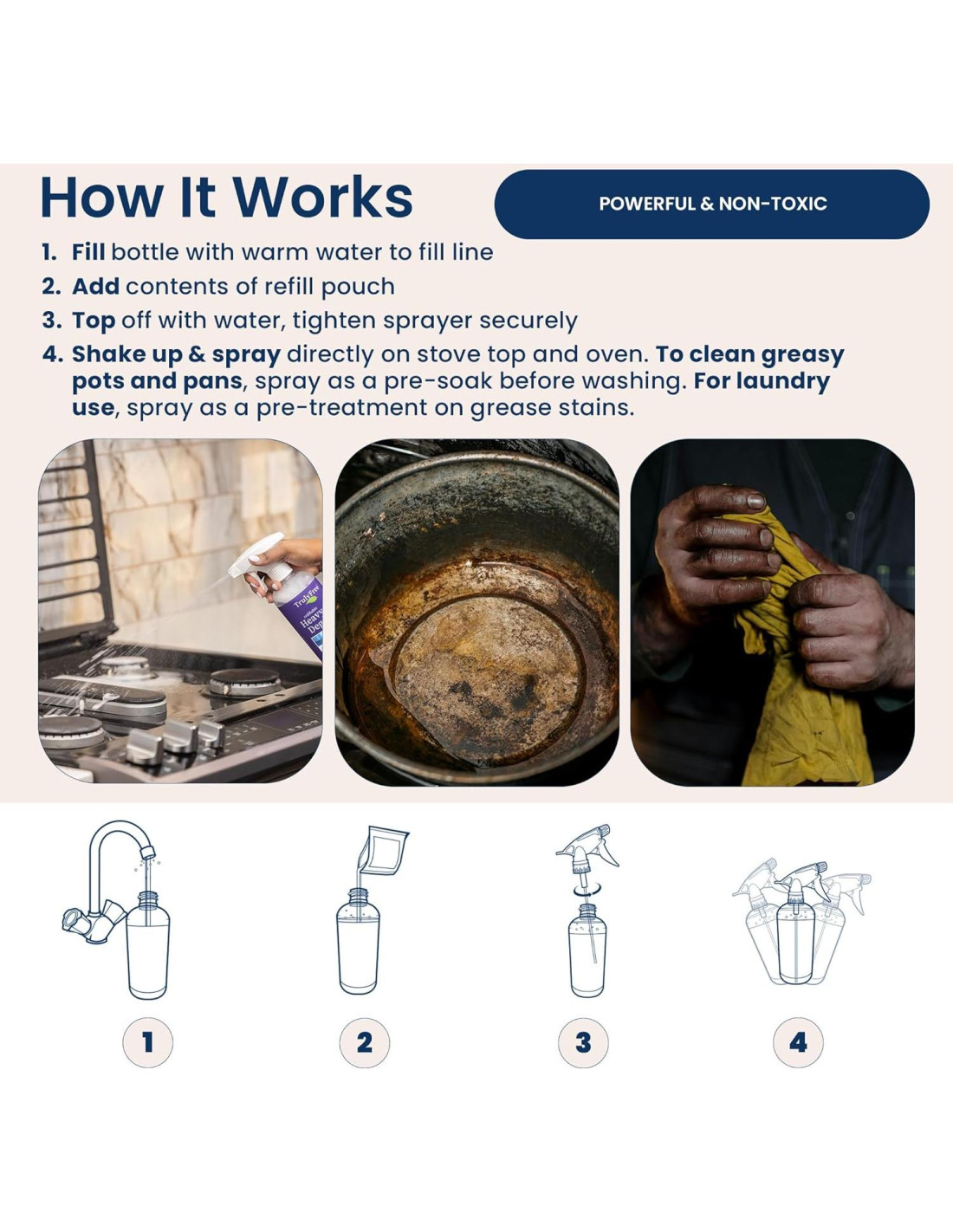 - FÁCIL DE USAR: Simplifica tu rutina de limpieza con nuestro desengrasante de alta dureza. Para electrodomésticos de cocina, simplemente rocía y limpia tu estufa y horno. Para limpiar ollas y sartenes grasientas, úsalo como un pre-remojado antes de lavar. Para la lavandería, rocía como un pre-tratamiento en manchas de grasa. Disfruta de una limpieza sin esfuerzo con resultados poderosos.