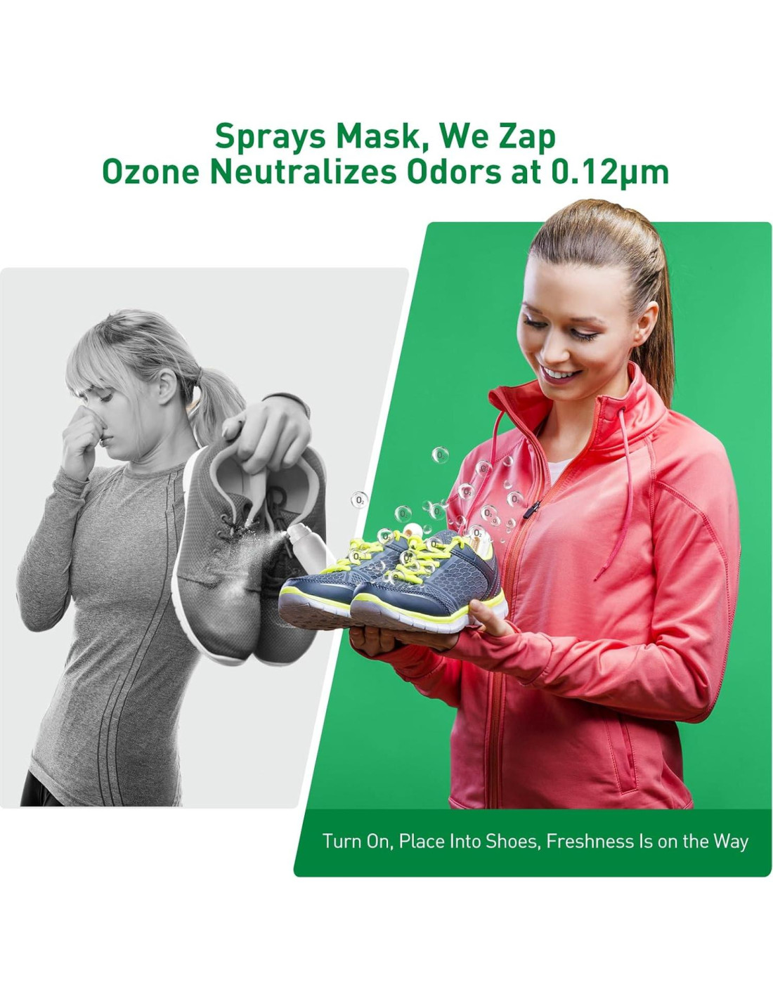 - Desodorante de Zapatos Sin Químicos: Impulsado por tecnología de ozono, una molécula de oxígeno altamente reactiva que descompone directamente las sustancias que causan olores, el ozono se descompone en oxígeno inofensivo en 30 minutos