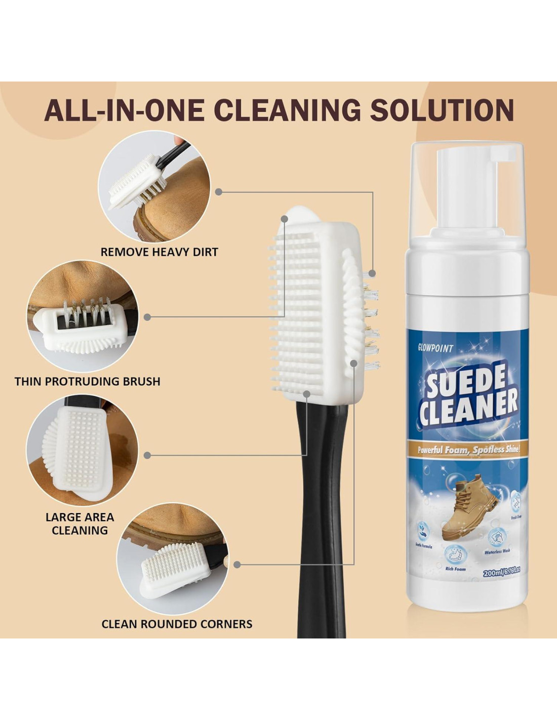 - Fácil y Conveniente de Usar: Diseñado con la conveniencia en mente, nuestro limpiador de ante para zapatos requiere solo tres pasos simples. Rocía el limpiador de zapatos en el área deseada, usa el cepillo incluido para una limpieza más profunda, luego limpia cualquier residuo con la toalla