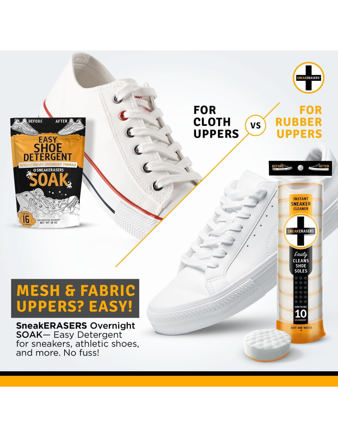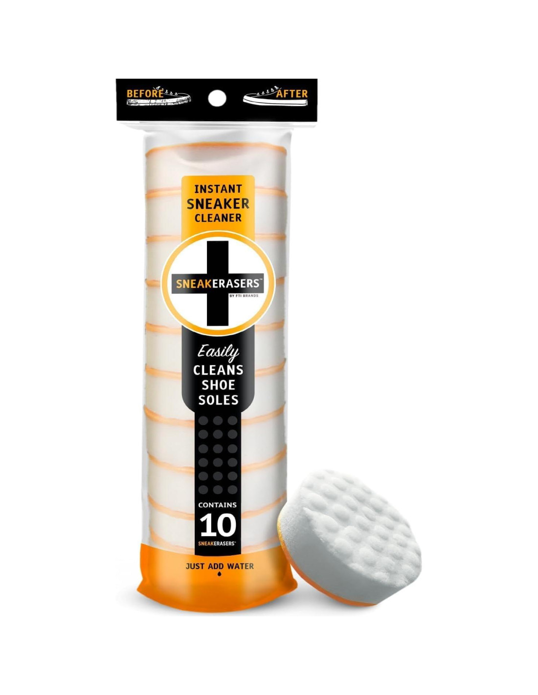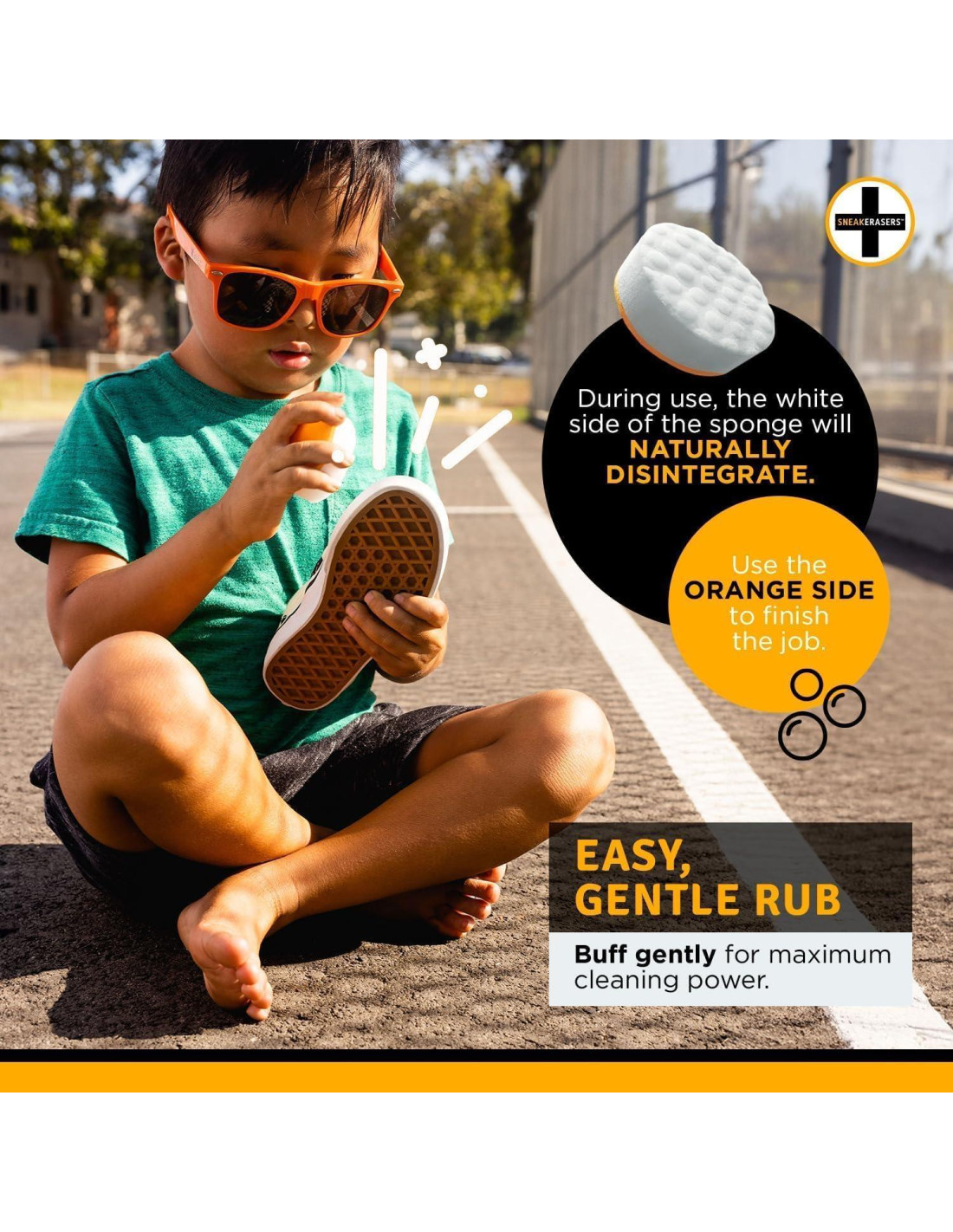 - PERFECTO PARA LIMPIAR SUELAS BLANCAS SUAVES: El limpiador de zapatos SneakERASERS está especialmente diseñado para suelas blancas suaves. El lado blanco de la esponja se descompone naturalmente a medida que lo usas, y el lado naranja ayuda a eliminar cualquier marca restante, dejándote con un acabado blanco y prístino.