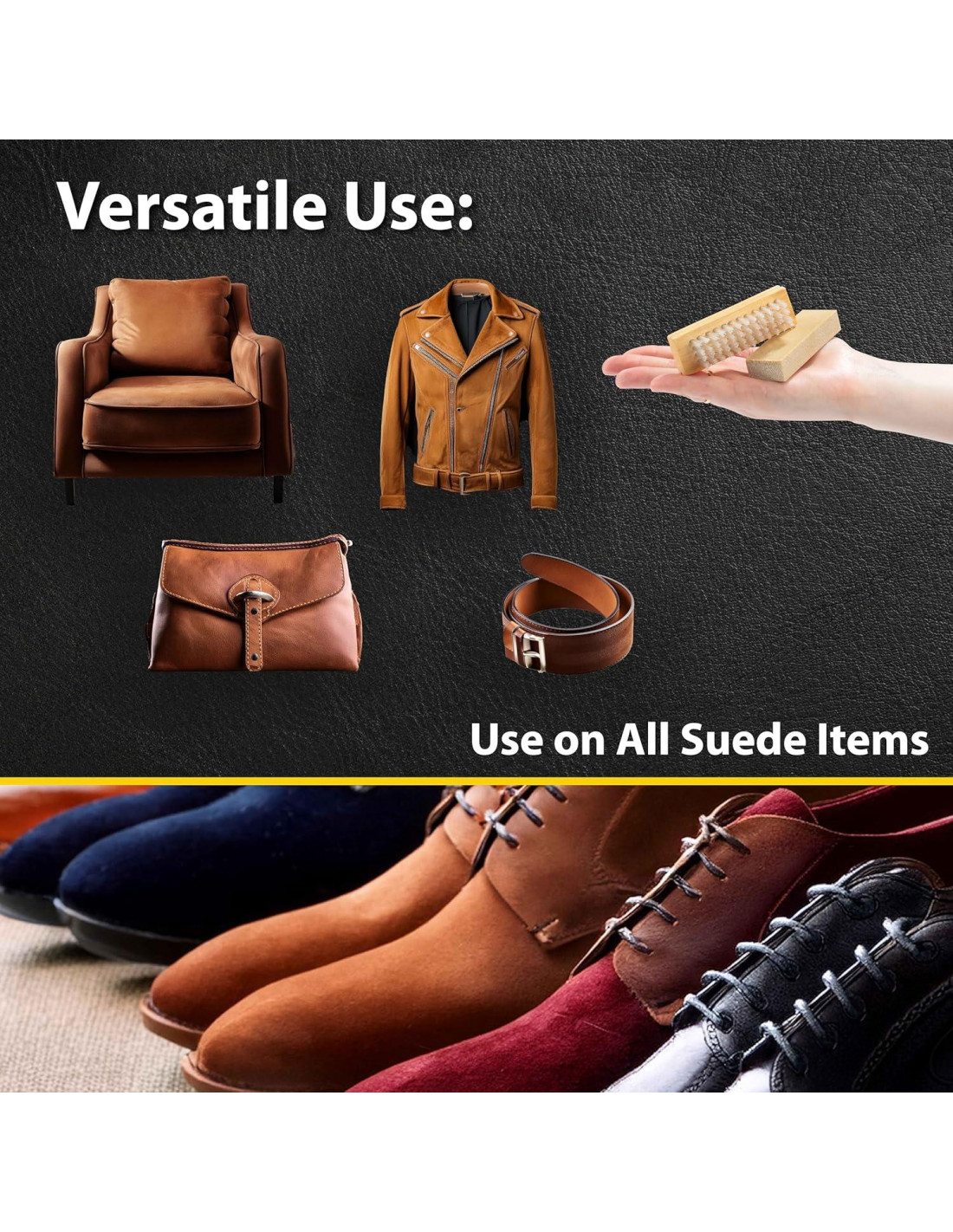 - VERSÁTIL: Limpia zapatos, botas, bolsas, abrigos, chaquetas, carteras, cinturones de ante y nubuck y más.