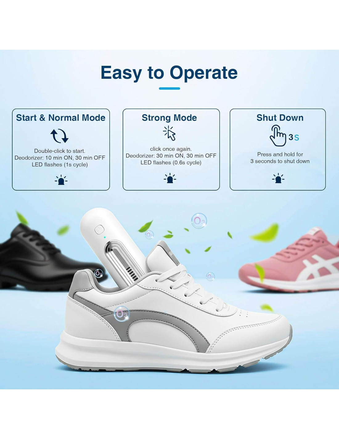 - Operación de Doble Modo: dos modos de trabajo - normal y fuerte (¡sin aire soplando!); Haz doble clic rápidamente para encender y entrar en modo normal, haz clic una vez para cambiar de marcha, mantén presionado para apagar; Los zapatos ligeramente olorosos se vuelven libres de olores después de aproximadamente 3 usos en modo fuerte, mientras que los zapatos con olores fuertes pueden necesitar alrededor de 7 usos; Los resultados pueden variar dependiendo de los materiales de los zapatos y la duración del uso