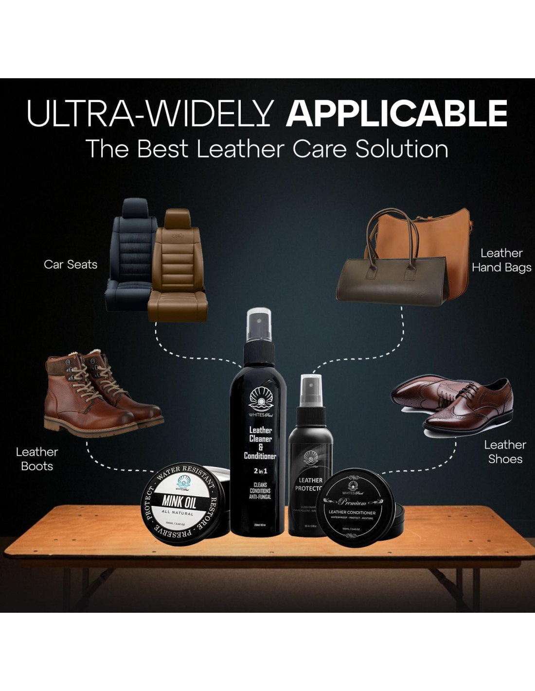 - LIMPIADOR Y ACONDICIONADOR DE CUERO: Whites Pearl ofrece un gran acondicionador de cuero que no solo restaura los productos de cuero a su estado clásico, sino que también los hace suaves y los protege contra daños por agua y sol.