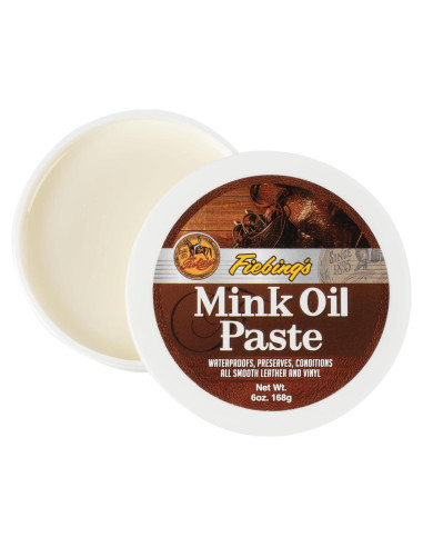 - INSTRUCCIONES: Aplique la pasta de aceite de visón libremente y trabaje bien en el cuero, particularmente alrededor de costuras y puntadas. Permita unos minutos para la absorción y luego limpie el exceso. Puede oscurecer ciertos cueros.