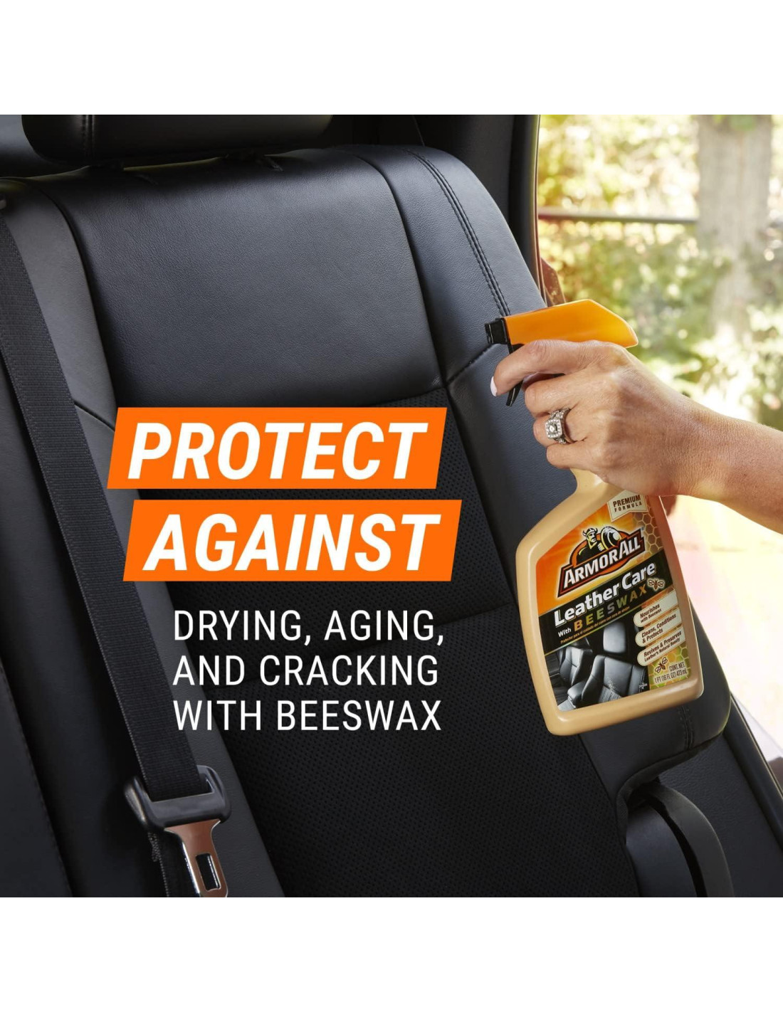 - Nutre el cuero con cera de abejas real en el Cuidado de Cuero Armor All con Cera de Abejas. La cera de abejas real para cuero se mezcla en este limpiador en spray para preservar la suavidad del cuero. Diseñado como un limpiador de tapicería de automóviles, este spray de cuero limpia, acondiciona y protege. El limpiador de cuero elimina la suciedad y la tierra para limpiar eficazmente el grano. El acondicionador de cuero restaura la suavidad y la rica belleza. Finalmente, el protector de cuero ayuda a proteger contra la deshidratación, el envejecimiento y las grietas. Aplica el limpiador de interiores de automóviles en las superficies de cuero de tu auto para revivir ese aspecto lujoso y proporcionar una protección duradera.