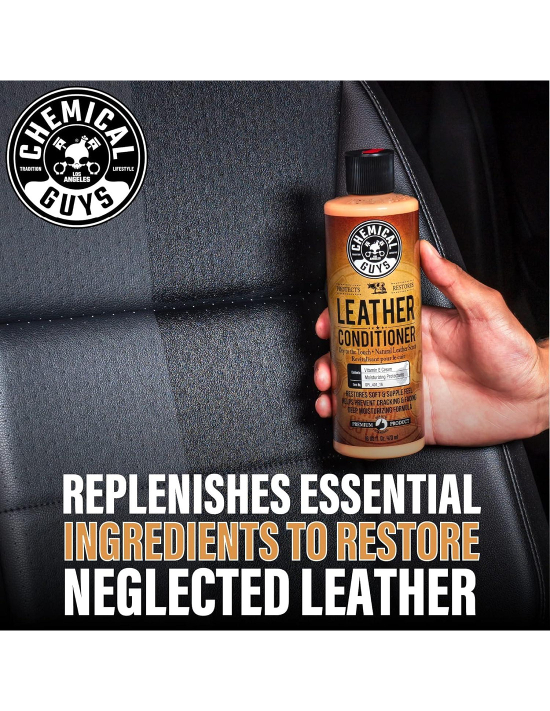 El Kit Completo de Cuidado de Cuero Limpiador y Acondicionador de Cuero dará nueva vida a tu cuero. Logra el aspecto y la sensación natural de un cuero suave y fantástico con el Limpiador y Acondicionador de Cuero. El Limpiador y Acondicionador de Cuero están ambos aprobados por OEM. El Limpiador de Cuero es incoloro e inodoro, el Acondicionador de Cuero tiene un sutil aroma a cuero y Vitamina E que nutre el cuero y ayuda a reducir el daño diario. El cuero es absolutamente impresionante cuando se trata y cuida adecuadamente. Limpiar y acondicionar son muy importantes para mantener el cuero en su mejor estado. El cuero maltratado o descuidado puede resultar en cuero seco, envejecido y agrietado. Instrucciones de Uso: 1. Aspira el área y retira los grandes desechos 2. Aplica el Limpiador de Cuero en el área deseada y déjalo reposar durante unos minutos antes de fregar 3. Frota con el Cepillo de Cerdas de Caballo Chemical Guys 4. Retira el exceso con una toalla de microfibra limpia 5. Aplica el Acondicionador de Cuero en un Aplicador de Microfibra de Grado Premium y trabaja en el cuero. Dependiendo de la condición de tu cuero, es posible que necesites 2 o 3 capas. (Consejo Profesional: Usa un aplicador del mismo color que el cuero que estás limpiando para ver la suciedad y mugre excesivas) Por Favor Nota: Siempre prueba en un área pequeña y poco visible antes del primer uso. ¿Qué herramienta es la adecuada para tu trabajo? Visita la tienda Chemical Guys en Amazon para ver nuestro arsenal completo; encuentra Consejos Profesionales, Promociones Especiales y Lanzamientos de Nuevos Productos. Enlace en la parte superior de la página, ¡haz clic en Seguir! Funciona de manera segura en todas las marcas de vehículos automotrices, incluyendo: Acura, Audi, BMW, Buick, Cadillac, Chevrolet (Chevy), Chrysler, Dodge, Fisker, Ford, GMC, Honda, Hummer, Hyundai, Infiniti, Isuzu, Jaguar, Jeep, Kia, Land Rover, Lexus, Lincoln, Mazda, Mercedes, Mercury, Mini, Mitsubishi, Nissan, Pontiac, Porsche, RAM, Saab, Subaru, Tesla, Toyota, Volkswagen y Volvo; y marcas de vehículos recreativos como Coachmen, Entegra, Forest River, Newmar, Thor Motor Coach, Winnebago, AirStream, K-Z, Keystone y Midwest Automotive Designs.