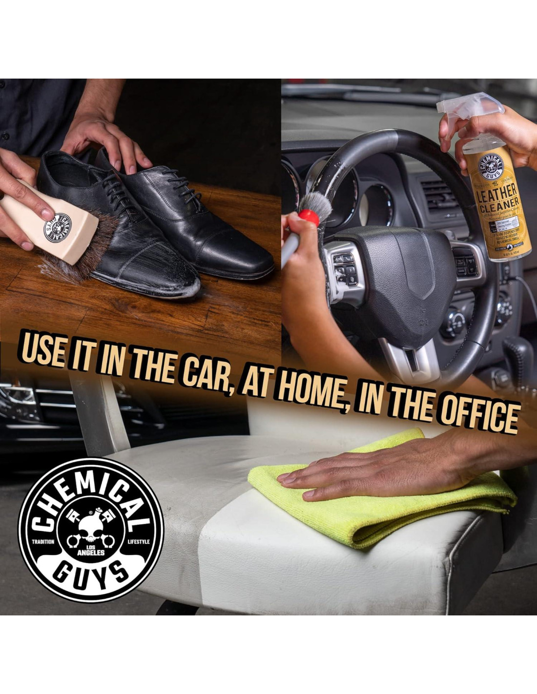 - MANTENLO LIMPIO: El Limpiador de Cuero de Chemical Guys mantiene tus asientos y accesorios de cuero limpios; la fórmula suave elimina la suciedad, grasa, aceites corporales y sudor de todos los tipos de cuero natural fino, cuero sellado duradero y materiales de cuero sintético.