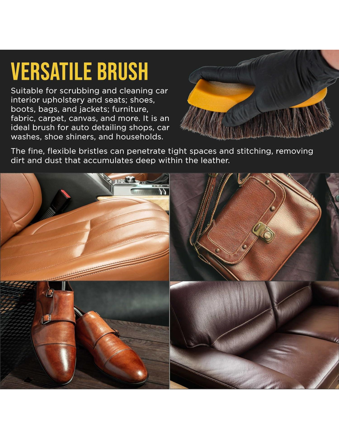 - Las suaves pero duraderas cerdas de pelo de caballo frotan, levantan y eliminan eficazmente la suciedad y las manchas superficiales de los productos de cuero sin causar daño. Las finas cerdas flexibles pueden penetrar en espacios reducidos y costuras, eliminando la suciedad y el polvo que se acumula profundamente dentro del cuero.