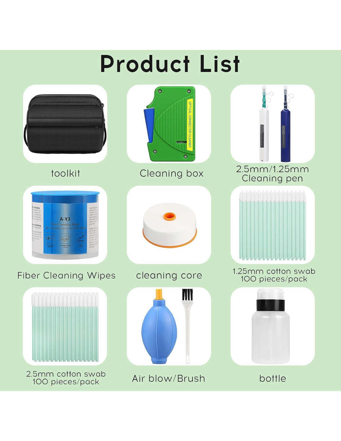 - [ Accesorios de herramientas de limpieza ] El kit de limpieza de fibra óptica incluye: caja de limpieza de fibra óptica, bolígrafo de limpieza SC LC, globo soplador, cepillo, botella de alcohol (botella vacía), papel libre de polvo, 1 paquete de hisopos de limpieza de 2.5mm y 1 paquete de hisopos de limpieza de 1.25mm