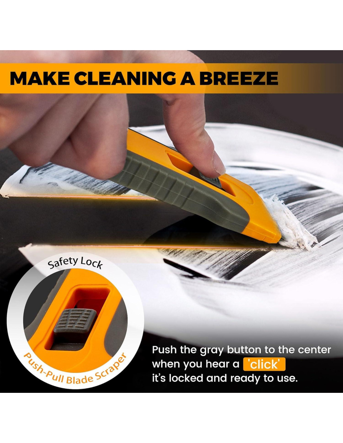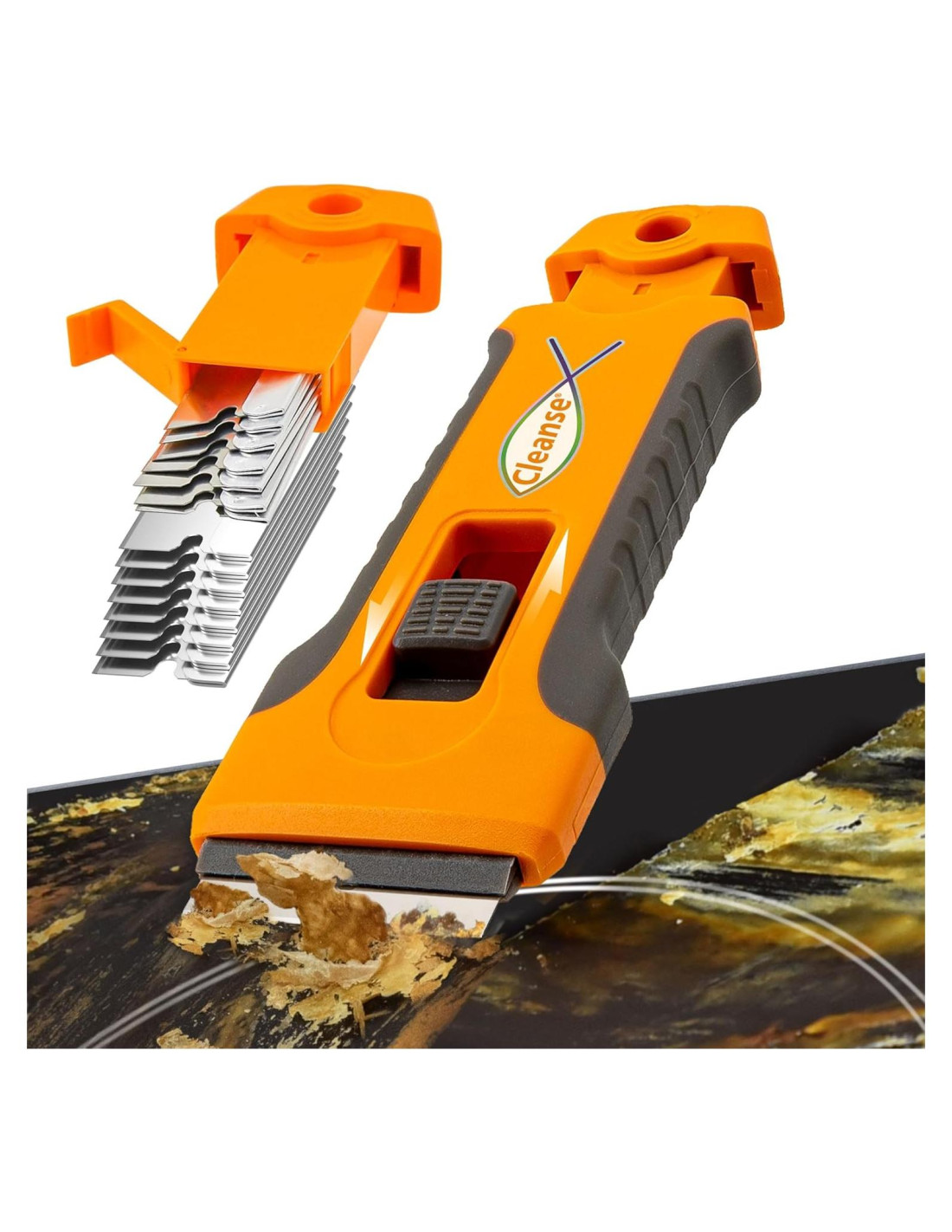 - Perfecto para usar en vidrio, cerámica y estufas de inducción, y es excelente para eliminar alimentos quemados y residuos, así como para raspar en el baño. También es efectivo para eliminar una variedad de otros materiales, incluyendo pintura de ventanas, cuñas, pinturas, adhesivos, residuos de películas de color, papel tapiz y bordes alrededor de la casa.