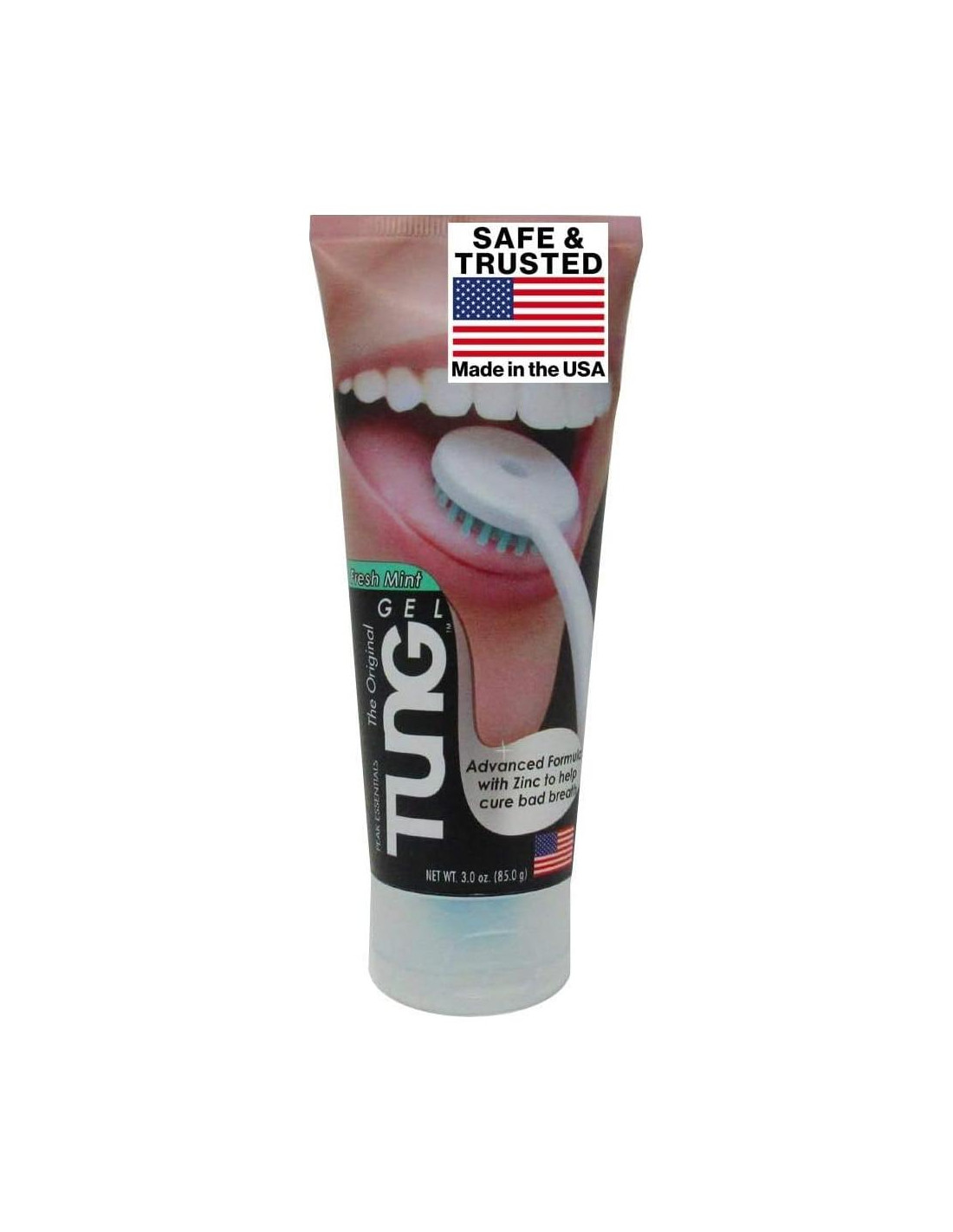 - El Gel TUNG Original: El gel TUNG contiene Zinc, que elimina de forma natural y segura el mal aliento al neutralizar el gas sulfúrico que proviene de la lengua. Dejará tu boca increíblemente fresca y no ensuciará tu cepillo de dientes que no está diseñado para la lengua.