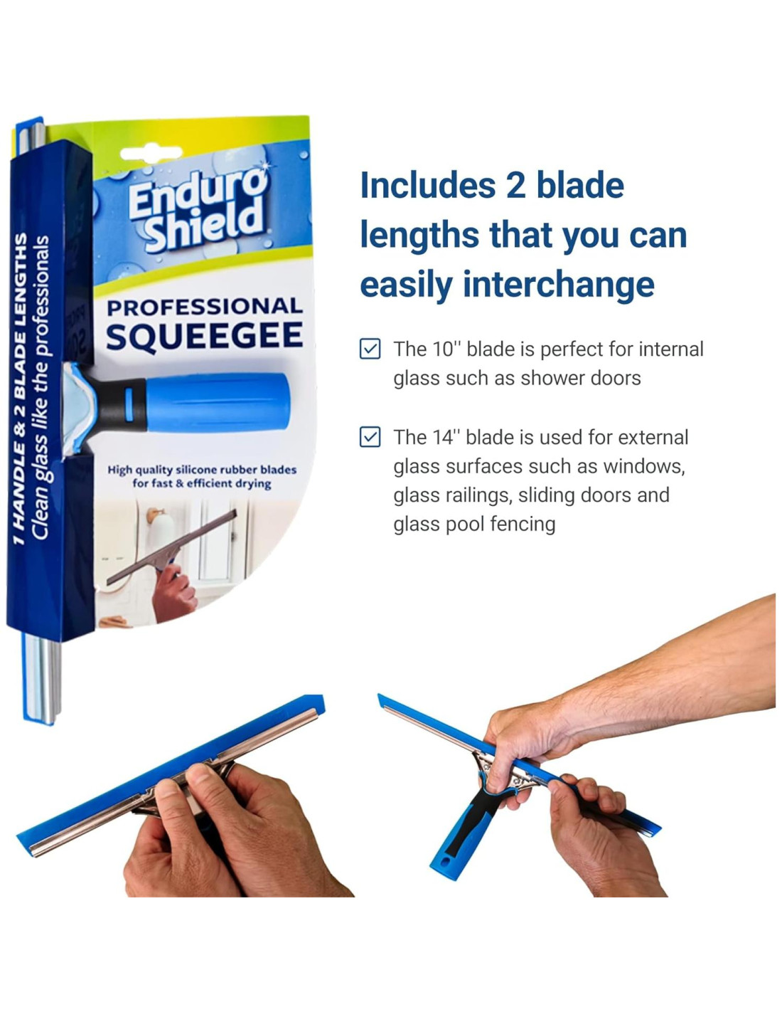 - Calidad Premium: Fabricado con materiales de alta calidad, nuestro raspador profesional garantiza durabilidad y un rendimiento duradero. Suministrado con 1 mango y 2 longitudes de hoja que puedes intercambiar fácilmente. La hoja de 10'' (25.4 cm) es perfecta para vidrio interno como puertas de ducha. La hoja de 14'' (35.6 cm) se utiliza para superficies de vidrio externas como ventanas, barandillas de vidrio, puertas corredizas y cercas de vidrio para piscinas.
