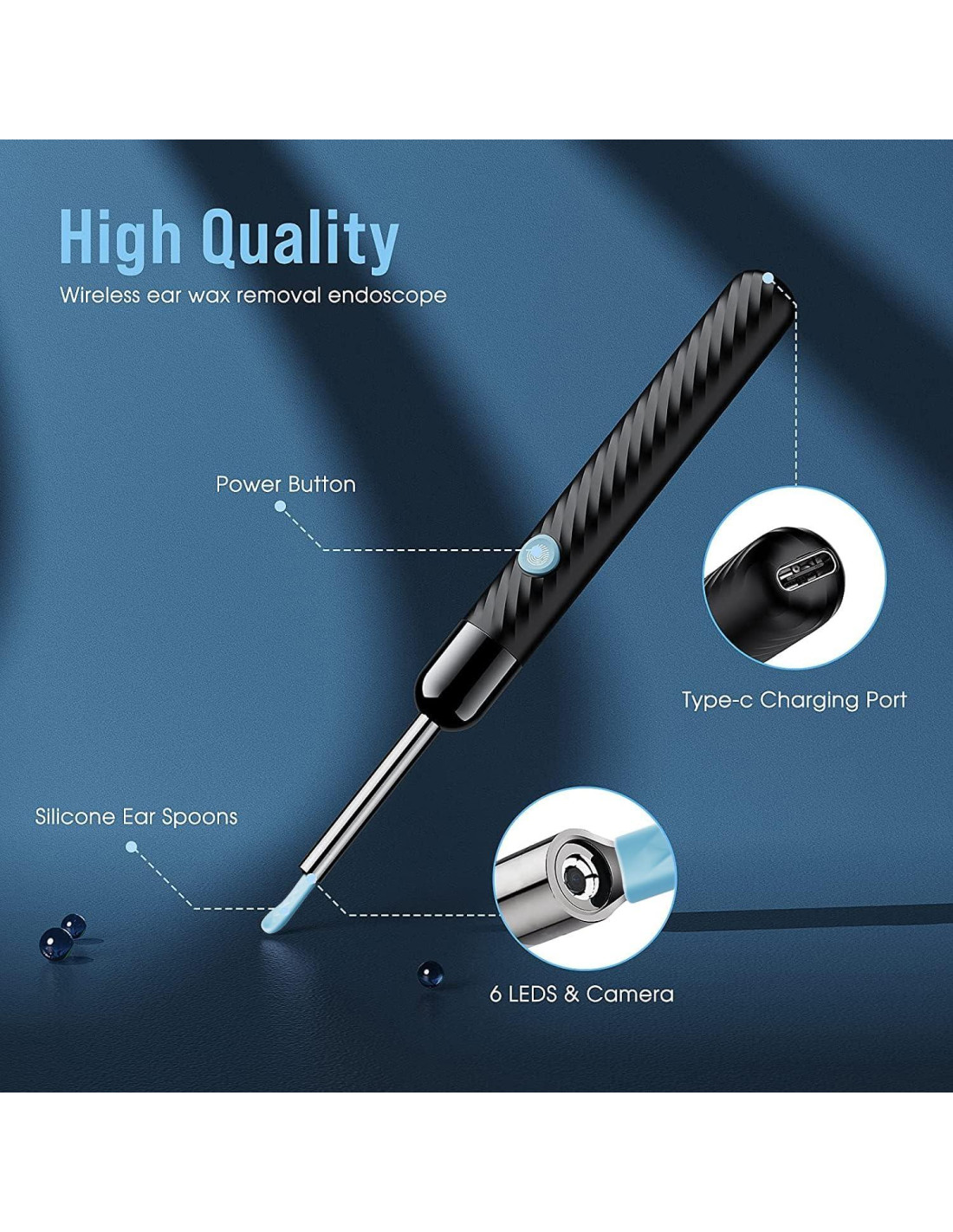 - Paquete: Kit de Eliminación de Cerumen con Luz*1, Cubierta de Tapón de Silicona*5, Botella de Almacenamiento de Cubierta de Tapón*1, Kit de Cucharas para Oídos Tradicional*7, Cable de Carga*1, Manual de Instrucciones*1
