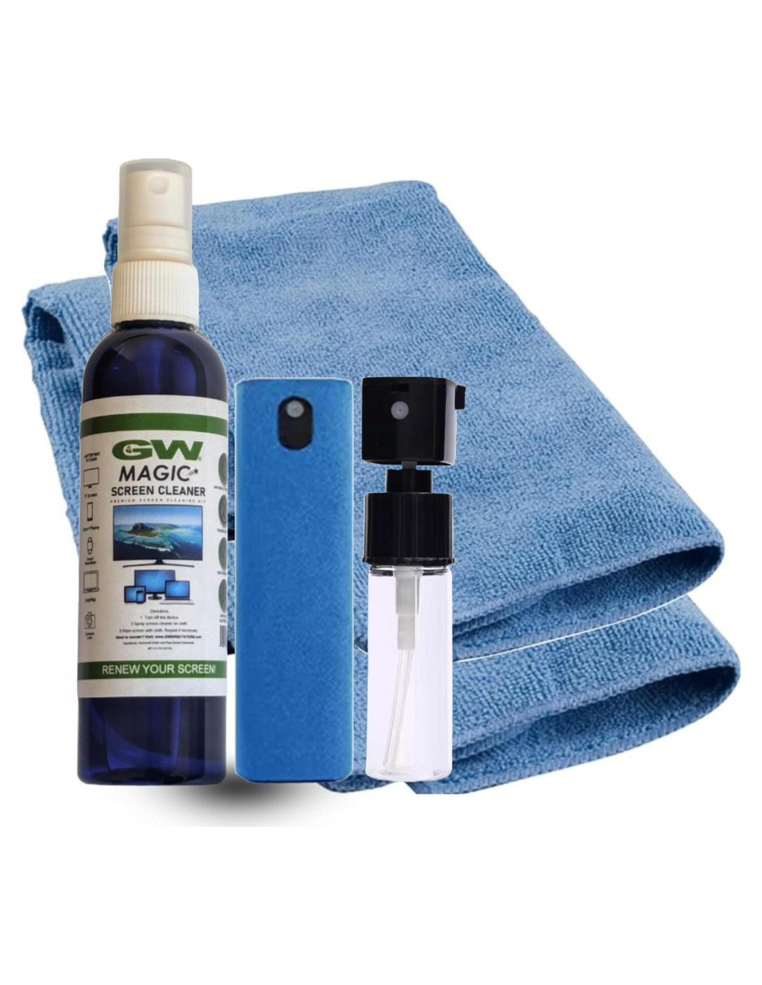 - Kit Completo: Incluye 2 grandes paños de microfibra premium lavables (30.48x30.48 cm), Limpiador Táctil 2 en 1, 1 spray Limpiador Mágico de Pantallas GW (4 oz).