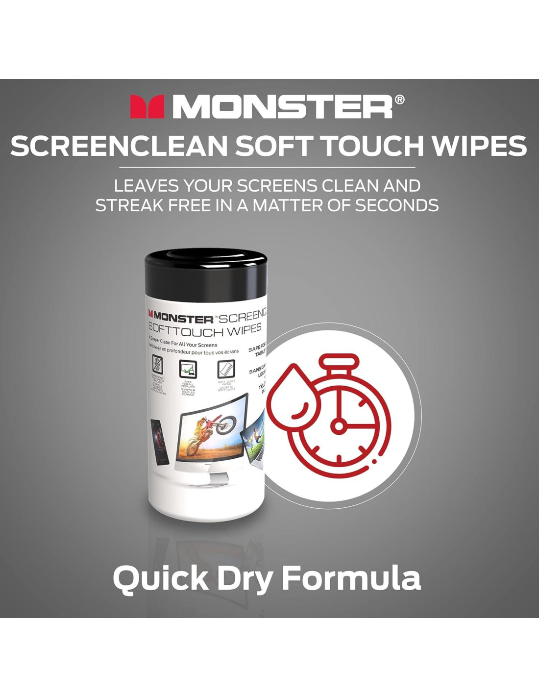 - Toallitas para Pantallas de Monitores y Más: Las toallitas limpiadoras de pantallas electrónicas Monster son ideales para una amplia gama de dispositivos, incluidos teléfonos celulares, tabletas, monitores de computadora, laptops o cualquier pantalla plana.