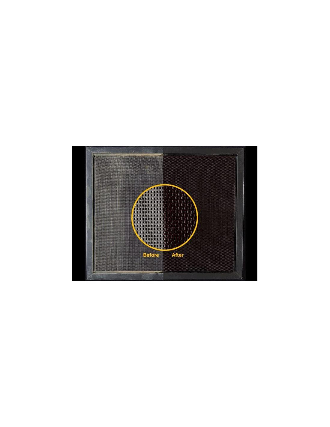 Nuestra fórmula especial de emulsiones, inhibidores de UV, agentes de brillo y repelentes de polvo no solo cubre el polvo, lo destruye. Las partículas de polvo se disuelven orgánicamente, haciendo que las pantallas se vean como nuevas y los repelentes de polvo ayudan a mantenerlas así. Mira el primer plano a continuación. A la izquierda puedes ver las partículas de polvo. El lado derecho fue tratado con Screen Magic. Puedes ver que prácticamente no hay partículas de polvo. Screen Magic funciona en todo tipo de pantallas. Pantallas de insectos, puertas corredizas de pantalla y pantallas solares de diferentes colores. No es necesario sacar los jabones y cepillos. En lugar de gastar tu tiempo fregando pantallas, usa Screen Magic. No es necesario enjuagar las pantallas con agua. Simplemente quita la pantalla, rocíala con Screen Magic y vuelve a colocarla. Las pantallas se verán como nuevas.
