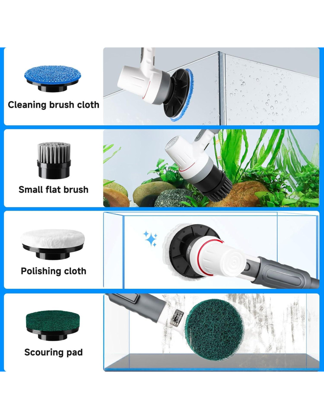 - 8 Cabezas de Cepillo Versátiles para Todas las Necesidades de Limpieza: Este limpiador de tanque de peces eléctrico incluye 8 cabezas de cepillo intercambiables, diseñadas para manejar diferentes tareas de limpieza. Perfecto para eliminar algas persistentes, fregar superficies de cristal y limpiar decoraciones de acuarios, también es adecuado para la limpieza del hogar, convirtiéndolo en una herramienta de limpieza verdaderamente multipropósito.