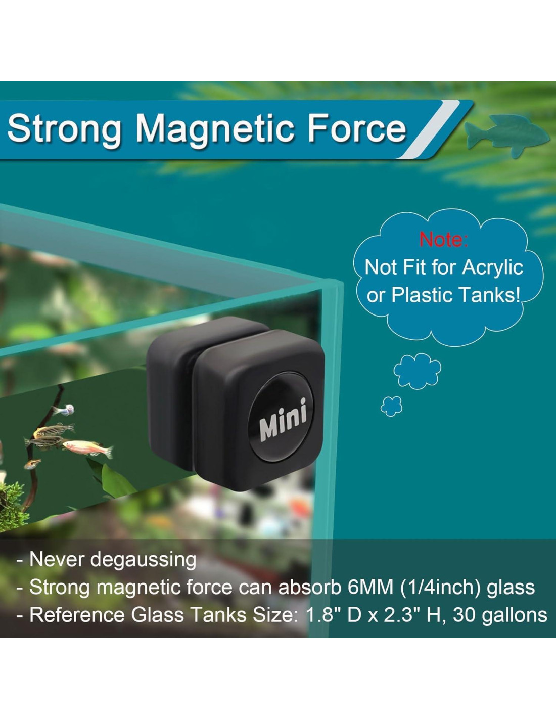 - Adecuado para Tipo de Tanque de Peces: El tamaño del limpiador magnético de vidrio para acuarios mini: 3*2.7cm, diseño ergonómico del mango, fácil de limpiar esquinas pequeñas o lugares de difícil acceso. Adecuado para tanques de peces de hasta 10 galones. Para vidrios planos de menos de 1/5 de pulgada de grosor, se puede limpiar bien.