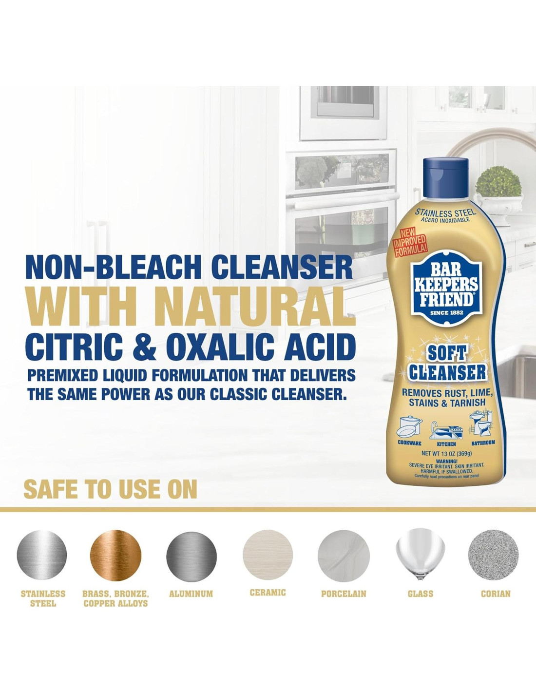 - Bar Keepers Friend Limpiador Suave: Este limpiador multiusos mantiene la vida simple. La espesa fórmula premezclada se adhiere a cada superficie - incluso verticales y acero inoxidable - para eliminar óxido, deslustre y grasa. Un efectivo removedor de manchas de agua dura