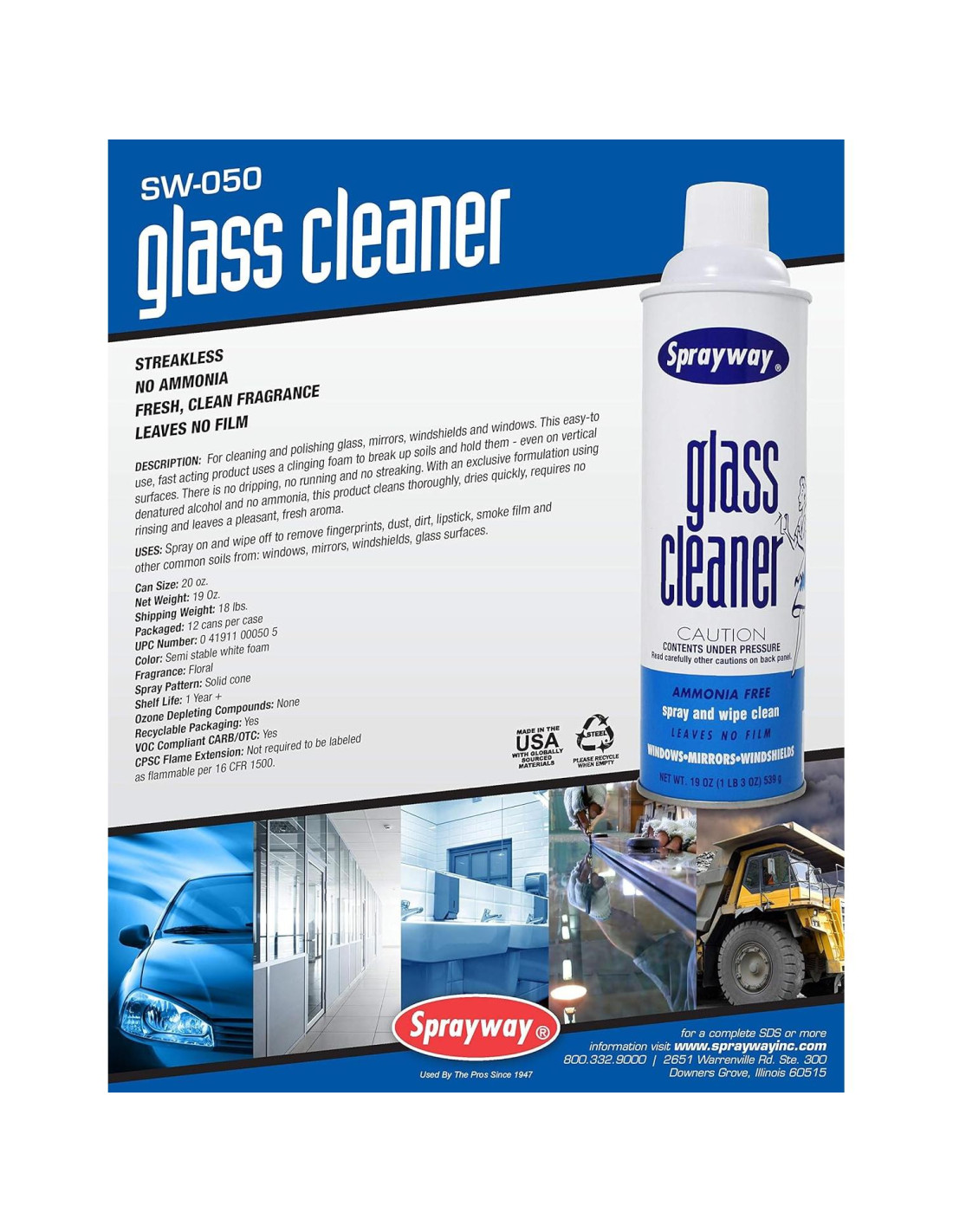 El Limpiador de Vidrios Sprayway limpia y pule vidrio, espejos, parabrisas y ventanas. Este producto de fácil uso y de acción rápida utiliza una espuma adherente para descomponer la suciedad y mantenerla, incluso en superficies verticales. No hay goteo, escurrimiento ni rayas. Con su fórmula exclusiva, que utiliza alcohol desnaturalizado y sin amoníaco, limpia a fondo, se seca rápidamente, no requiere enjuague y deja un aroma agradable y fresco. Pack de 6.