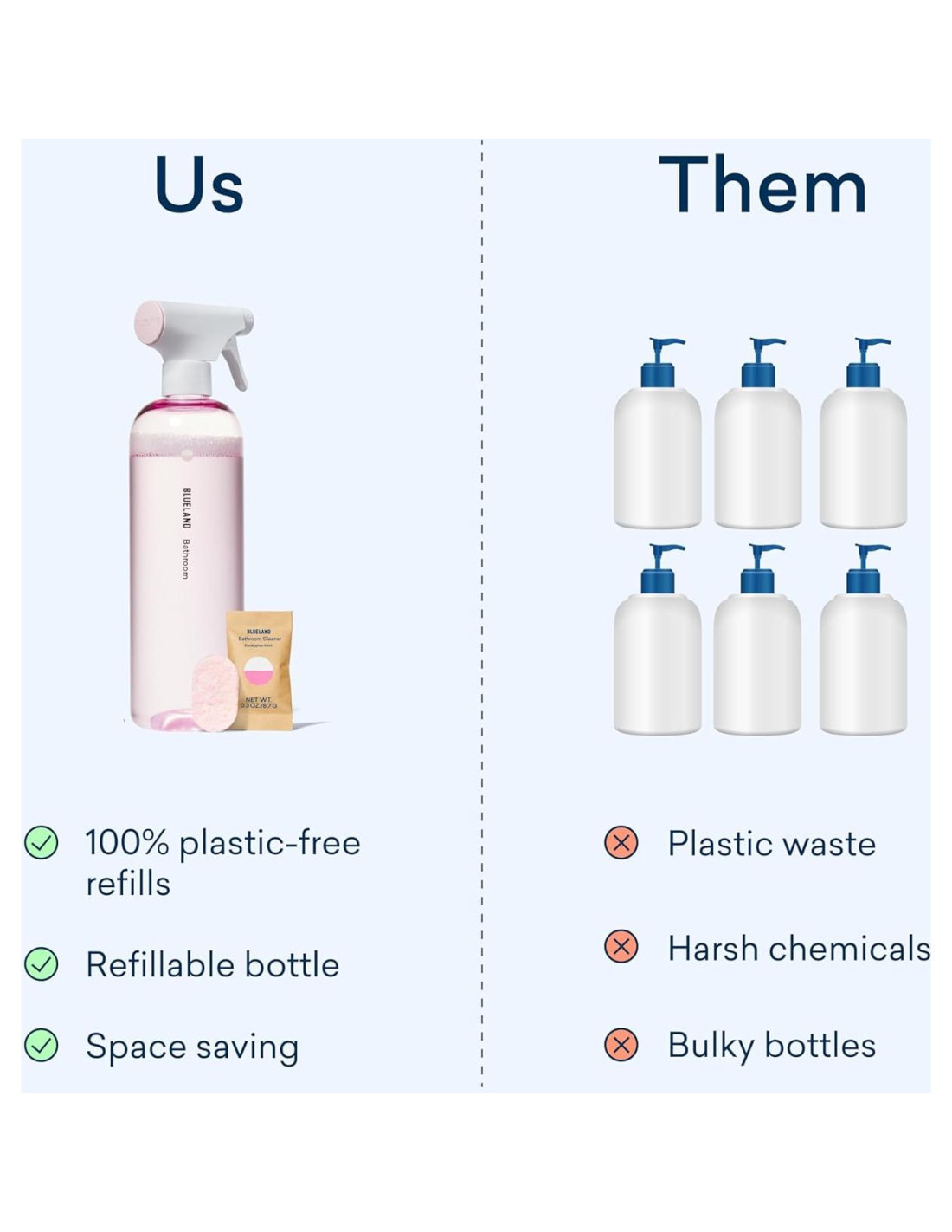 - LIMPIADOR DE BAÑO RECARGABLE Y ECOLÓGICO. Limpiador en spray galardonado diseñado para ser reutilizado y recargado una y otra vez, eliminando la necesidad de plástico de un solo uso. Compra la botella una vez y recarga para siempre con tabletas 100% libres de plástico que vienen en empaques compostables a base de papel. ¡Ahorra hasta 25 botellas de limpieza de plástico de un solo uso al año!