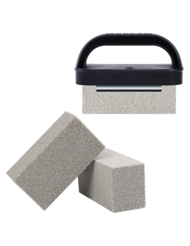 - Mango Reutilizable: Cada conjunto de bloque de limpieza de plancha contiene 3 bloques de plancha grises y 1 mango, fácil de instalar y más seguro, lo protege de la superficie caliente de la parrilla durante la limpieza.