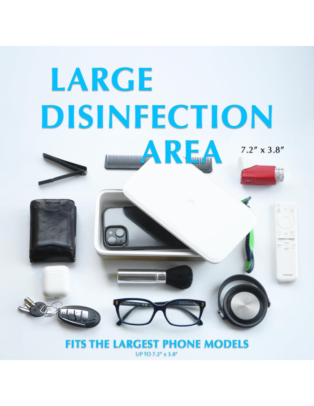 - | Gran Interior que Acomoda Más que Solo Teléfonos | El diseño espacioso de Cleanse Crate con un área interna de 7.2 x 3.8 x 1.5 pulgadas (18.3 x 9.7 x 3.8 cm) acomoda no solo smartphones, sino también AirPods, billeteras, gafas de sol, llaves y más, desinfectando múltiples artículos en un solo ciclo.